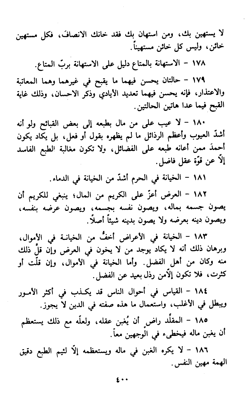 183 - الخيانة في الأعراض أخف من الخيانة في الأموال، وبرهان ذلك أنه لا يكاد يوجد من لا يخون في العرض وإن قل ذلك منه وكان من اهل الفضل. وأما الخيانة في الأموال، وإن قلت أو كثرت، فلا تكون إلا من رذل بعيد عن الفضل.