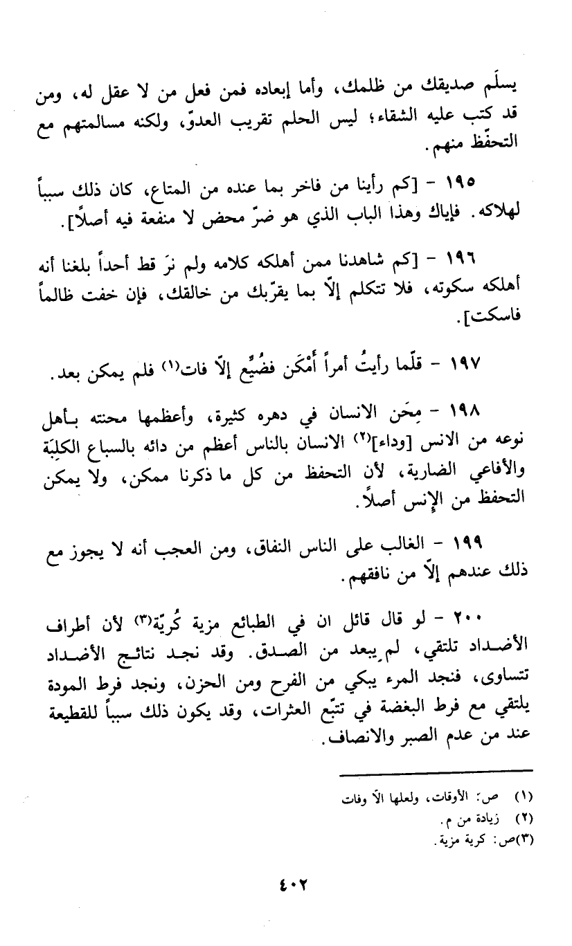 200 - لو قال قائل ان في الطبائع مزية كرية (3) لأن أطراف الأضداد تلتقي، لم يبعد من الصدق. وقد نجد نتائج الأضداد تتساوى، فنجد المرء يبكي من الفرح ومن الحزن، ونجد فرط المودة يلتقي مع فرط البغضة في تتبع العثرات، وقد يكون ذلك سبباً للقطيعة عند عدم الصبر والإنصاف.