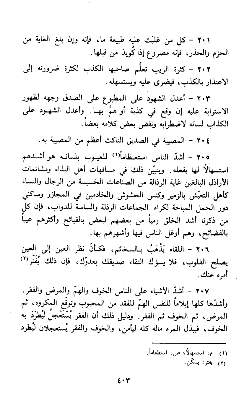 207 - أشد الأشياء على الناس الخوف والهم والمرض والفقر. وأشدها كلها إيلاماً للنفس الهم للفقد من المحبوب وتوقع المكروه، ثم المرض، ثم الخوف ثم الفقر. ودليل ذلك ان الفقر يستعجل ليطرد به الخوف، فيبذل المرء ماله كله ليامن، والخوف والفقر يستعجلان ليطرد