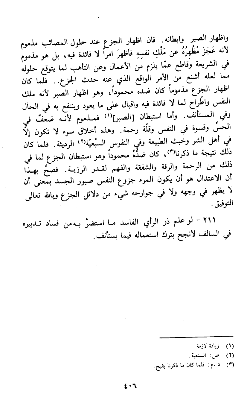 وإظهار الصبر وإبطانه. فان اظهار الجزع عند حلول المصائب مذموم لانه عجز مظهره عن ملك نفسه فأظهر امراً لا فائدة فيه، بل هو مذموم في الشريعة وقاطع عما يلزم من الأعمال وعن التأهب لما يتوقع حلوله مما لعله أشنع من الأمر الواقع الذي عنه حدث الجزع.. فلما كان إظهار الجزع مذموماً كان ضده محمودا، وهو إظهار الصبر لأنه ملك النفس واطراح لما لا فائدة فيه وإقبال على ما يعود وينتفع به في الحال وفي المستأنف. وأما استبطان [الصبر] (1) فمذموم لأنه ضعف في الحس وقسوة في النفس وقلة رحمة. وهذه أخلاق سوء لا تكون إلا في أهل الشر وخبث الطبيعة وفي النفوس السبعية (2) الرديئة. فلما كان ذلك نتيجة ما ذكرنا (3) ، كان ضده محموداً وهو استبطان الجزع لما في ذلك من الرحمة والرقة والشفقة والفهم لقدر الرزية. فصح بهذا أن الاعتدال هو أن يكون المرء جزوع النفس صبور الجسد بمعنى أن لا يظهر في وجهه ولا في جوارحه شيء من دلائل الجزع وبالله تعالى التوفيق.