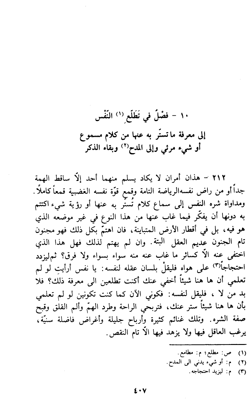 212 - هذان أمران لا يكاد يسلم منهما أحد إلا ساقط الهمة جداً أو من راض نفسه الرياضة التامة وقمع قوة نفسه الغضبية قمعاً كاملاً. ومداواة شره النفس إلى سماع كلام تستر به عنها أو رؤية شيء اكتتم به دونها أن يفكر فيما غاب عنها من هذا النوع في غير موضعه الذي هو فيه، بل في أقطار الأرض المتباينة، فان اهتم بكل ذلك فهو مجنون تام الجنون عديم العقل البتة. وأن لم يهتم لذلك فهل هذا الذي اختفى عنه إلا كسائر ما غاب عنه منه سواء بسواء ولا فرق ثم ليزدد احتجاجاً (3) على هواه فليقل بلسان عقله لنفسه: يا نفس أرأيت لو لم تعلمي ان ها هنا شيئاً أخفي عنك أكنت تطلعين إلى معرفة ذلك فلا بد من لا، فليقل لنفسه: فكوني الآن كما كنت تكونين لو لم تعلمي بان ها هنا شيئاً ستر عنك، فتربحي الراحة وطرد الهم وألم القلق وقبح صفة الشره. وتلك غنائم كثيرة وأرباح جليلة وأغراض فاضلة سنية، يرغب العاقل فيها ولا يزهد فيها إلا تام النقص.
