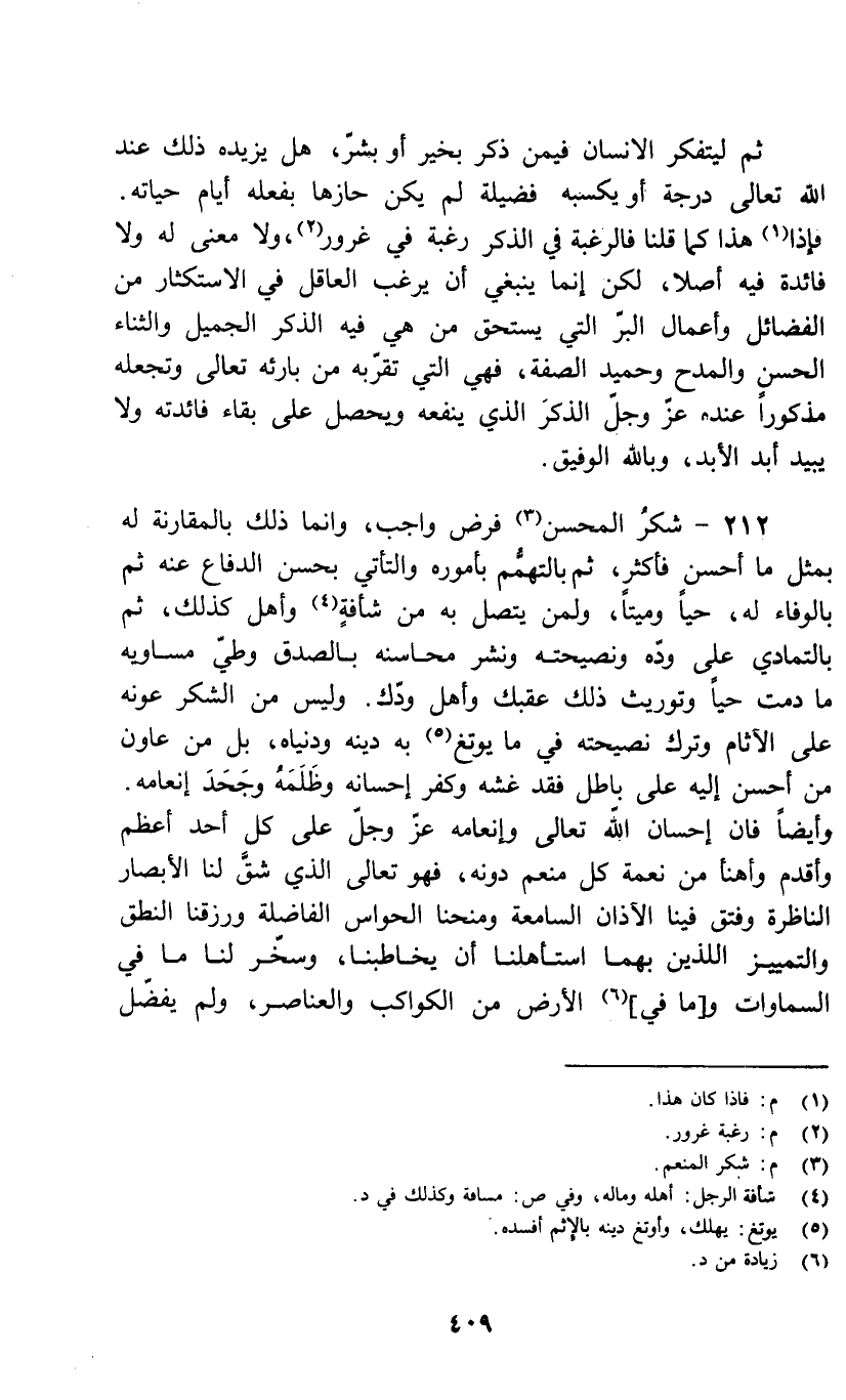 214 - شكر المحسن (3) فرض واجب، وإنما ذلك بالمقارنة له يمثل ما احسن فاكثر، ثم بالتهمم بأموره والتأتي بحسن الدفاع عنه ثم بالوفاء له، حياً وميتاً، ولمن يتصل به من شأفة (4) وأهل كذلك، ثم بالتمادي على وده ونصيحته ونشر محاسنه بالصدق وطي مساويه ما دمت حياً وتوريث ذلك عقبك وأهل ودك. وليس من الشكر عونه على الآثام وترك نصيحته في ما يوتغ (5) به دينه ودنياه، بل من عاون من أحسن إليه على باطل فقد غشه وكفر إحسانه وظلمه وجحد إنعامه. وأيضاً فان إحسان الله تعالى وإنعامه عز وجل على كل أحد اعظم واقدم وأهنأ من نعمة كل منعم دونه، فهو تعالى الذي شق لنا الإبصار الناظرة وفتق فينا الآذان السامعة ومنحنا الحواس الفاضلة ورزقنا النطق والتمييز اللذين بهما استأهلنا ان يخاطبنا، وسخر لنا ما في السماوات و [ما في] (6) الأرض من الكواكب والعناصر، ولم يفضل