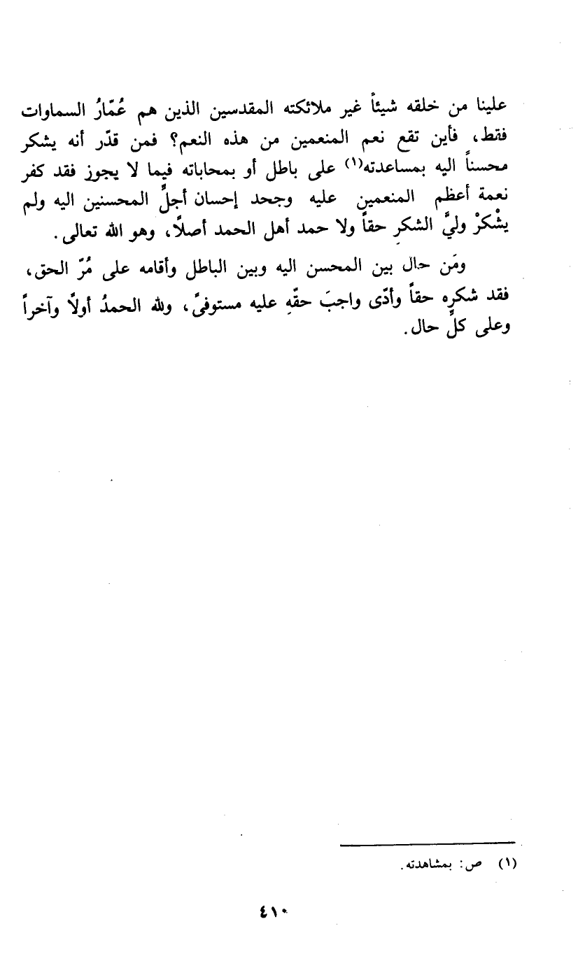 علينا من خلقه شيئاً غير ملائكته المقدسين الذين هم عمار السماوات فقط، فأين تقع نعم المنعمين من هذه النعم فمن قدر انه يشكر محسناً إليه بمساعدته (1) على باطل أو بمحاباته فيما لا يجوز فقد كفر نعمة اعظم المنعمين عليه وجحد إحسان اجل المحسنين إليه ولك يشكر ولي الشكر حقاً ولا حمد أهل الحمد أصلاً، وهو الله تعالى.