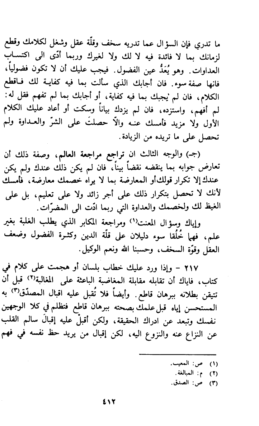 (ج) والوجه الثالث ان تراجع مراجعة العالم، وصفة ذلك أن تعارض جوابه بما ينقضه نقضاً بيناً، فان لم يكن ذلك عندك ولم يكن عندك إلا تكرار قولك أو المعارضة بما لا يراه خصمك معارضة، فأمسك لأنك لا تحصل بتكرار ذلك على أجر زائد ولا على تعليم، بل على الغيظ لك ولخصمك والعداوة التي ربما ادت إلى المضرات.