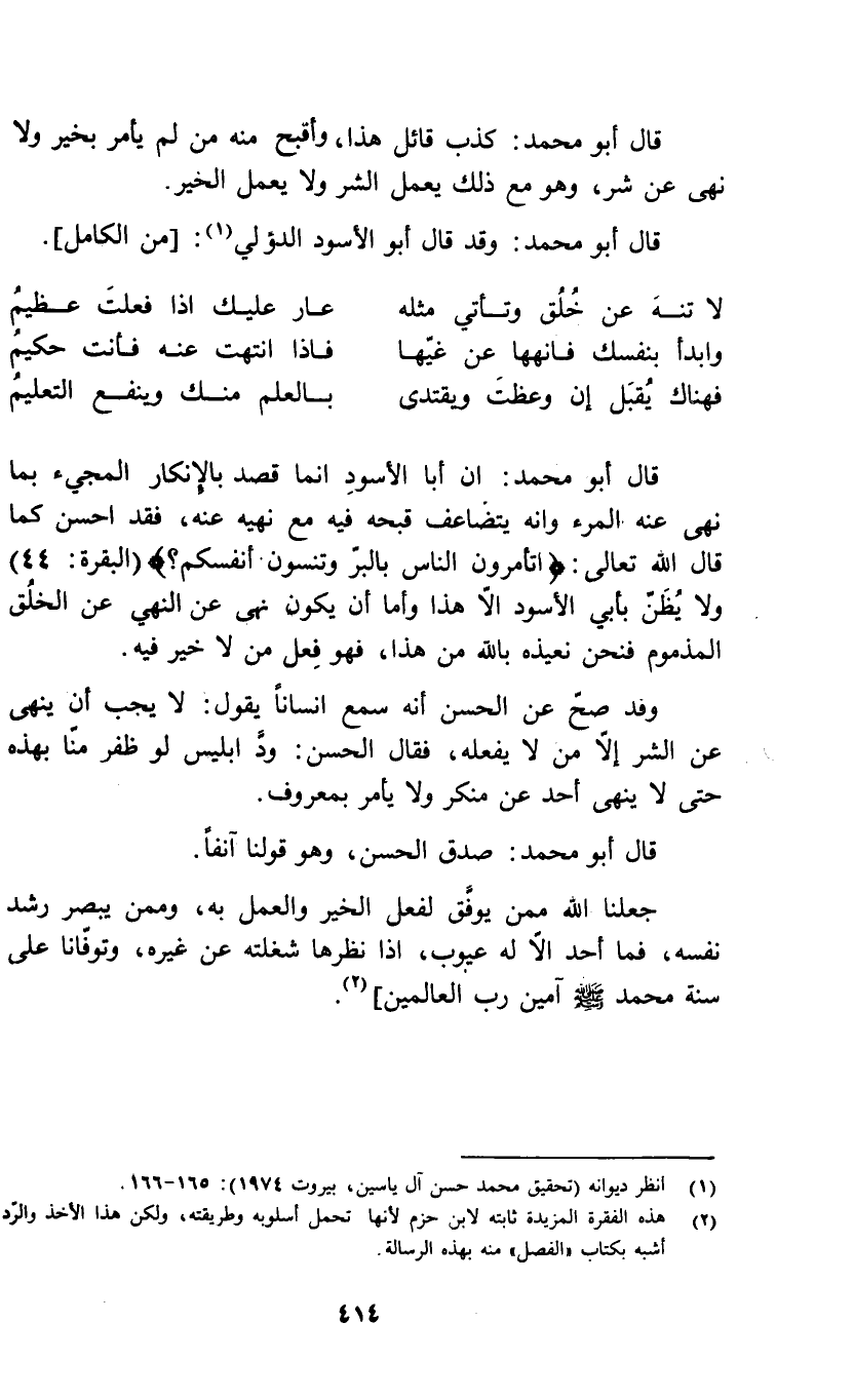 فهناك يقبل إن وعظت ويقتدى ... بالعلم منك وينفع التعليم قال أبو محمد: ان أبا الأسود انما قصد بالإنكار المجيء بما نهى عنه المرء وانه يتضاعف قبحه فيه مع نهيه عنه، فقد احسن كما قال الله تعالى: {اتأمرون الناس بالبر وتنسون أنفسكم} (البقرة: 44) ولا يظن بأبي الأسود الا هذا وأما أن يكون نهى عن النهي عن الخلق المذموم فنحن نعيذه بالله من هذا، فهو فعل من لا خير فيه.