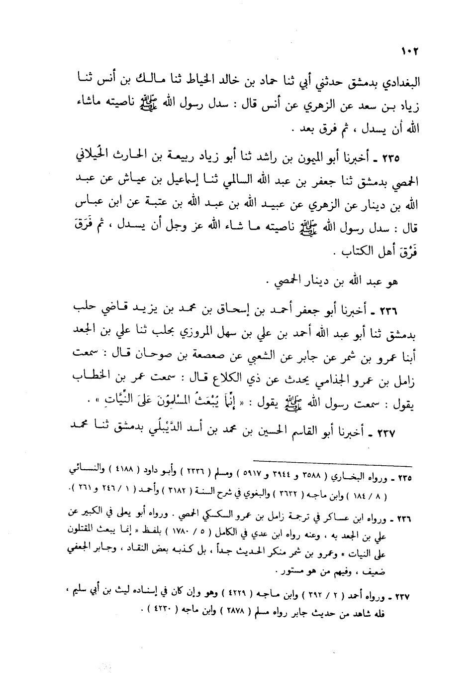 236 - أَخْبَرَنَا أَبُو جَعْفَرٍ أَحْمَدُ بْنُ إِسْحَاقَ بْنِ مُحَمَّدِ بْنِ يَزِيدَ قَاضِي حَلَبَ بِدِمَشْقَ، ثنا أَبُو عَبْدِ اللَّهِ أَحْمَدُ بْنُ عَلِيِّ بْنِ سَهْلٍ الْمَرْوَزِيُّ، بِحَلَبَ، ثنا عَلِيُّ بْنُ الْجَعْدِ، أبنا عَمْرُو بْنُ شَمِرٍ، عَنْ جَابِرٍ، عَنِ الشَّعْبِيِّ، عَنْ صَعْصَعَةَ بْنِ صُوحَانَ، قَالَ: سَمِعْتُ زَامِلَ بْنَ عَمْرٍو الْجُذَامِيَّ، يُحَدِّثُ عَنْ ذِي الْكُلَاعِ، قَالَ: سَمِعْتُ عُمَرَ بْنَ الْخَطَّابِ، يَقُولُ: سَمِعْتُ رَسُولَ اللَّهِ صَلَّى اللهُ عَلَيْهِ وَسَلَّمَ يَقُولُ: §«إِنَّمَا يُبْعَثُ الْمُسْلِمُونَ عَلَى النِّيَّاتِ»