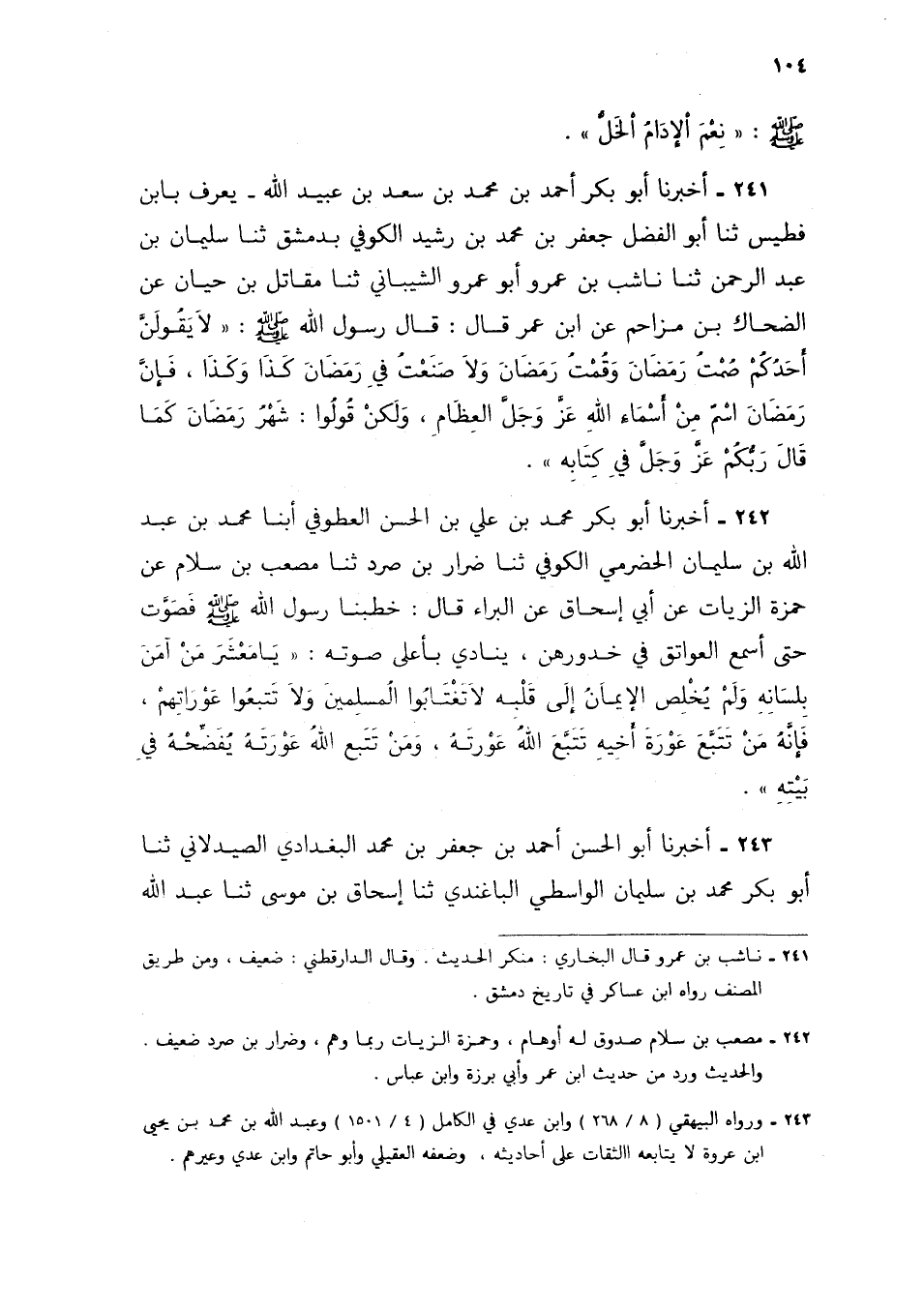 241 - أَخْبَرَنَا أَبُو بَكْرٍ أَحْمَدُ بْنُ مُحَمَّدِ بْنِ سَعْدِ بْنِ عُبَيْدِ اللَّهِ يُعْرَفُ بِابْنِ فُطَيْسٍ، ثنا أَبُو الْفَضْلِ جَعْفَرُ بْنُ مُحَمَّدِ بْنِ رُشَيْدٍ الْكُوفِيُّ بِدِمَشْقَ، ثنا سُلَيْمَانُ بْنُ عَبْدِ الرَّحْمَنِ، ثنا نَاشِبُ بْنُ عَمْرٍو أَبُو عَمْرٍو الشَّيْبَانِيُّ، ثنا مُقَاتِلُ بْنُ حَيَّانَ، عَنِ الضَّحَّاكِ بْنِ مُزَاحِمٍ، عَنِ ابْنِ عُمَرَ، قَالَ: قَالَ رَسُولُ اللَّهِ صَلَّى اللهُ عَلَيْهِ وَسَلَّمَ: " §لَا يَقُولَنَّ أَحَدُكُمْ صُمْتُ رَمَضَانَ، وَقُمْتُ رَمَضَانَ، وَلَا صَنَعْتُ فِي رَمَضَانَ كَذَا وَكَذَا، فَإِنَّ رَمَضَانَ اسْمٌ مِنْ أَسْمَاءِ اللَّهِ عَزَّ وَجَلَّ الْعِظَامِ، وَلَكِنْ قُولُوا: شَهْرُ رَمَضَانَ كَمَا قَالَ رَبُّكُمْ عَزَّ وَجَلَّ فِي كِتَابِهِ "