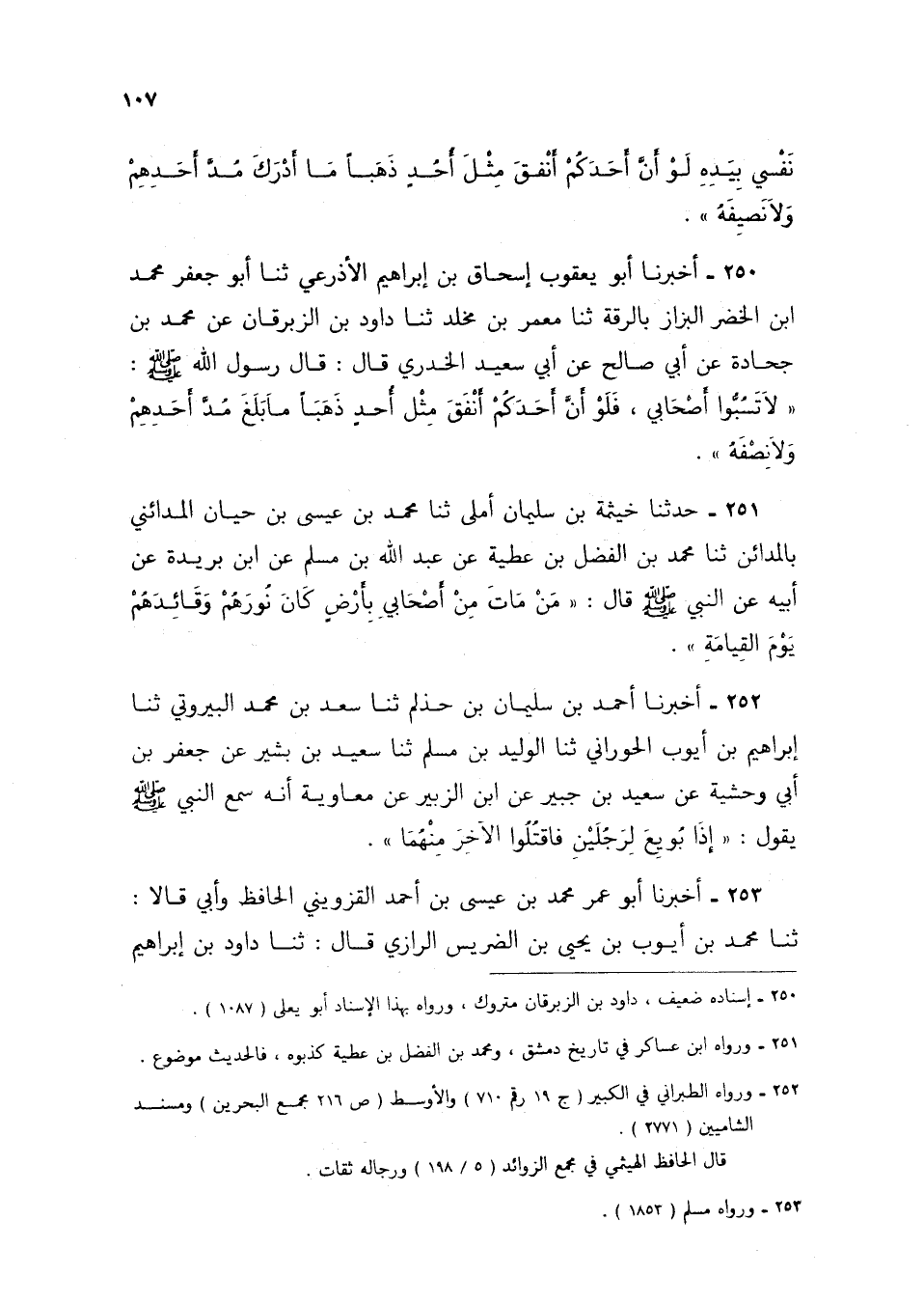 250 - أَخْبَرَنَا أَبُو يَعْقُوبَ إِسْحَاقُ بْنُ إِبْرَاهِيمَ الْأَذْرَعِيُّ، ثنا أَبُو جَعْفَرٍ مُحَمَّدُ بْنُ الْخَضِرِ الْبَزَّازُ، بِالرَّقَّةِ، ثنا مَعْمَرُ بْنُ مَخْلَدٍ، ثنا دَاوُدُ بْنُ الزِّبْرِقَانِ، عَنْ مُحَمَّدِ بْنِ جُحَادَةَ، عَنْ أَبِي صَالِحٍ، عَنْ أَبِي سَعِيدٍ الْخُدْرِيِّ، قَالَ: قَالَ رَسُولُ اللَّهِ صَلَّى اللهُ عَلَيْهِ وَسَلَّمَ: «§لَا تَسُبُّوا أَصْحَابِي، فَلَوْ أَنَّ أَحَدَكُمْ أَنْفَقَ مِثْلَ أُحُدٍ ذَهَبًا، مَا بَلَغَ مُدَّ أَحَدِهِمْ وَلَا نِصْفَهُ»