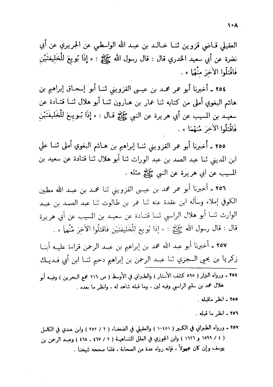 256 - أَخْبَرَنَا أَبُو عُمَرَ مُحَمَّدُ بْنُ سَعِيدٍ الْقَزْوِينِيُّ، ثنا مُحَمَّدُ بْنُ عَبْدِ اللَّهِ مُطَيَّنٌ الْكُوفِيُّ إِمْلَاءً، وَسَأَلَهُ ابْنُ عُقْدَةَ عَنْهُ، ثنا عُمَرُ بْنُ طَالُوتَ، ثنا عَبْدُ الصَّمَدِ بْنُ عَبْدِ الْوَارِثِ، ثنا أَبُو هِلَالٍ الرَّاسِبِيُّ، ثنا قَتَادَةُ، عَنْ سَعِيدِ بْنِ الْمُسَيِّبِ، عَنْ أَبِي هُرَيْرَةَ، قَالَ: قَالَ رَسُولُ اللَّهِ صَلَّى اللهُ عَلَيْهِ وَسَلَّمَ: §«إِذَا بُويِعَ لِلْخَلِيفَتَيْنِ فَاقْتُلُوا الْآخِرَ مِنْهُمَا»