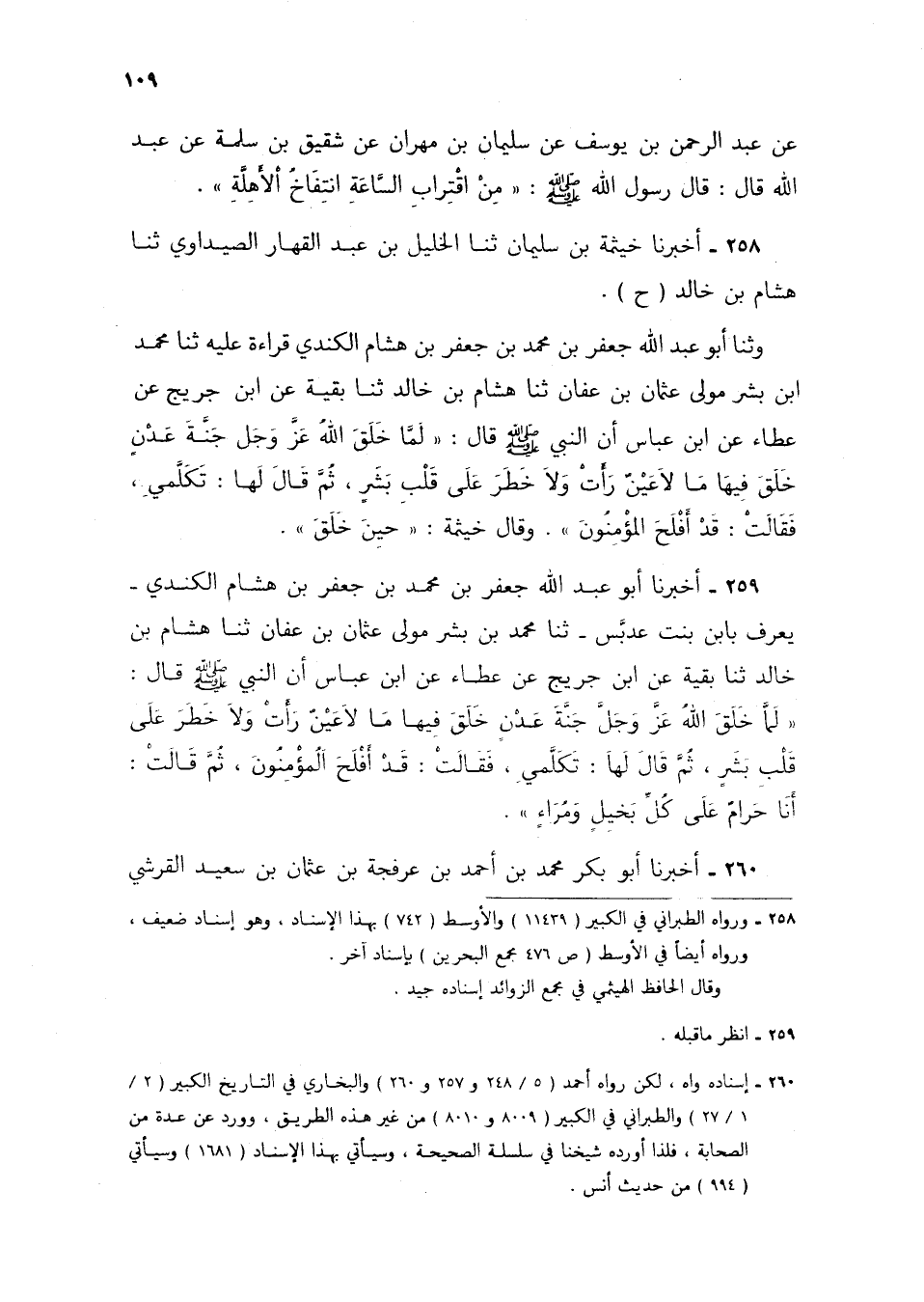 258 - أَخْبَرَنَا خَيْثَمَةُ بْنُ سُلَيْمَانَ، ثنا الْخَلِيلُ بْنُ عَبْدِ الْقَهَّارِ الصَّيْدَاوِيُّ، ثنا هِشَامُ بْنُ خَالِدٍ، ح وَثنا أَبُو عَبْدِ اللَّهِ جَعْفَرُ بْنُ مُحَمَّدِ بْنِ جَعْفَرِ بْنِ هِشَامٍ الْكِنْدِيُّ قِرَاءَةً عَلَيْهِ، ثنا مُحَمَّدُ بْنُ بِشْرٍ، مَوْلَى عُثْمَانَ بْنِ عَفَّانَ، ثنا هِشَامُ بْنُ خَالِدٍ، ثنا بَقِيَّةُ، عَنِ ابْنِ جُرَيْجٍ، عَنْ عَطَاءٍ، عَنِ ابْنِ عَبَّاسٍ، أَنَّ النَّبِيَّ صَلَّى اللهُ عَلَيْهِ وَسَلَّمَ قَالَ: §" لَمَّا خَلَقَ اللَّهُ عَزَّ وَجَلَّ جَنَّةَ عَدْنٍ خَلَقَ فِيهَا مَا لَا عَيْنٌ رَأَتْ، وَلَا خَطَرَ عَلَى قَلْبِ بَشَرٍ، ثُمَّ قَالَ لَهَا: تَكَلَّمِي فَقَالَتْ: {قَدْ أَفْلَحَ الْمُؤْمِنُونَ} [المؤمنون: 1] " وَقَالَ خَيْثَمَةُ: «حِينَ خَلَقَ»