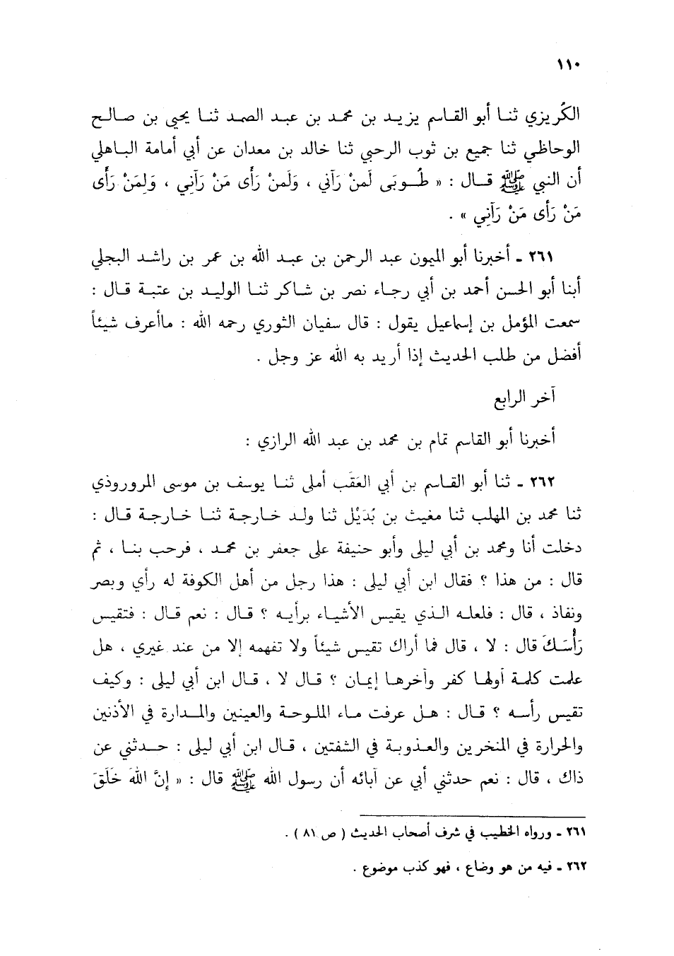 261 - أَخْبَرَنَا أَبُو الْمَيْمُونِ عَبْدُ الرَّحْمَنِ بْنُ عَبْدِ اللَّهِ بْنِ عُمَرَ بْنِ رَاشِدٍ الْبَجَلِيُّ، أبنا أَبُو الْحَسَنِ أَحْمَدُ بْنُ أَبِي رَجَاءٍ نَصْرُ بْنُ شَاكِرٍ، ثنا الْوَلِيدُ بْنُ عُتْبَةَ، قَالَ: سَمِعْتُ الْمُؤَمَّلَ بْنَ إِسْمَاعِيلَ، يَقُولُ: قَالَ سُفْيَانُ الثَّوْرِيُّ رَحِمَهُ اللَّهُ: §«مَا أَعْرِفُ شَيْئًا أَفْضَلَ مِنْ طَلَبِ الْحَدِيثِ إِذَا أُرِيدَ بِهِ اللَّهُ عَزَّ وَجَلَّ»