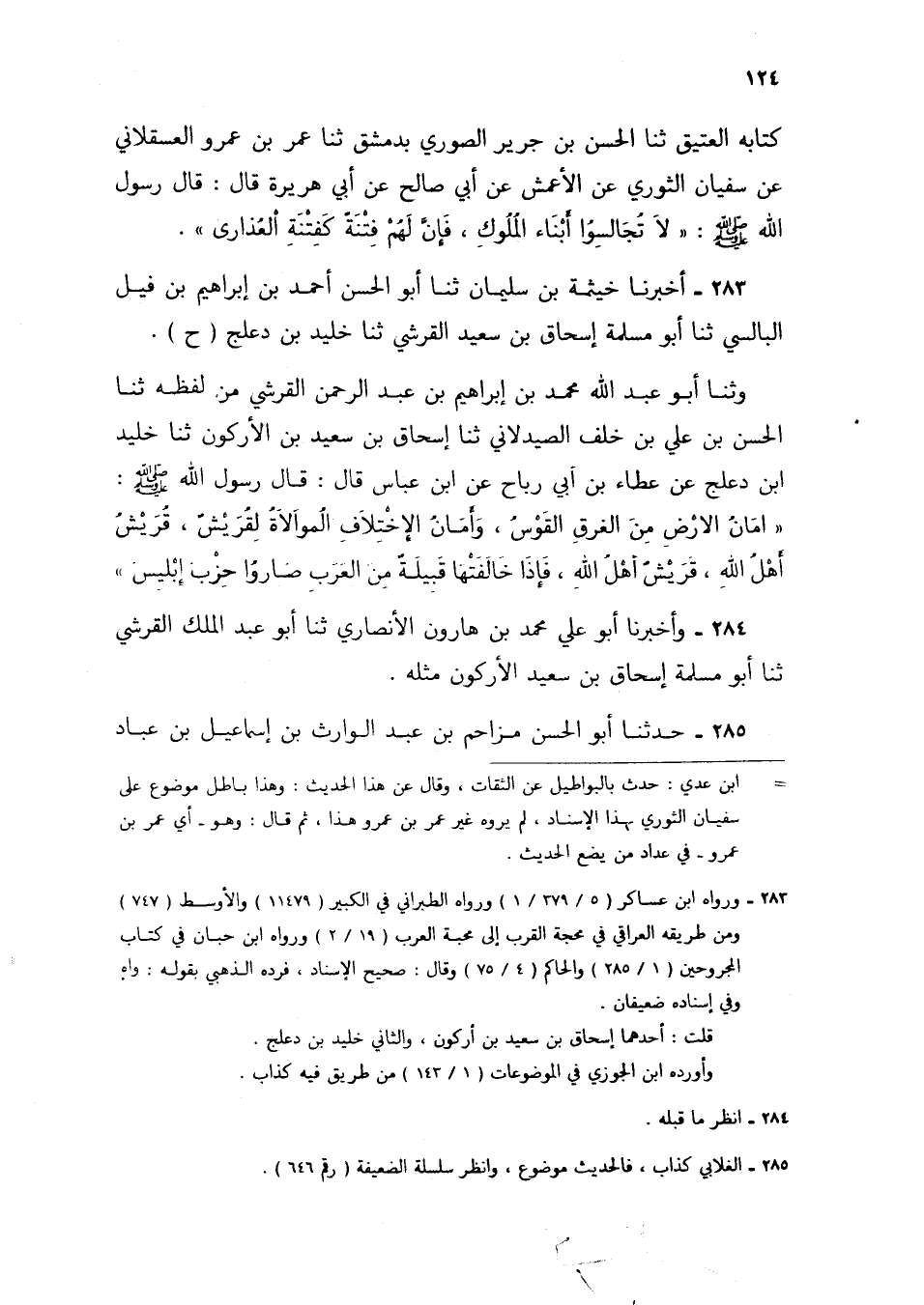 284 - وَأَخْبَرَنَا أَبُو عَلِيٍّ مُحَمَّدُ بْنُ هَارُونَ الْأَنْصَارِيُّ، ثنا أَبُو عَبْدِ الْمَلِكِ الْقُرَشِيُّ، ثنا أَبُو مَسْلَمَةَ إِسْحَاقُ بْنُ سَعِيدٍ الْأُرْكُونَ مِثْلَهُ