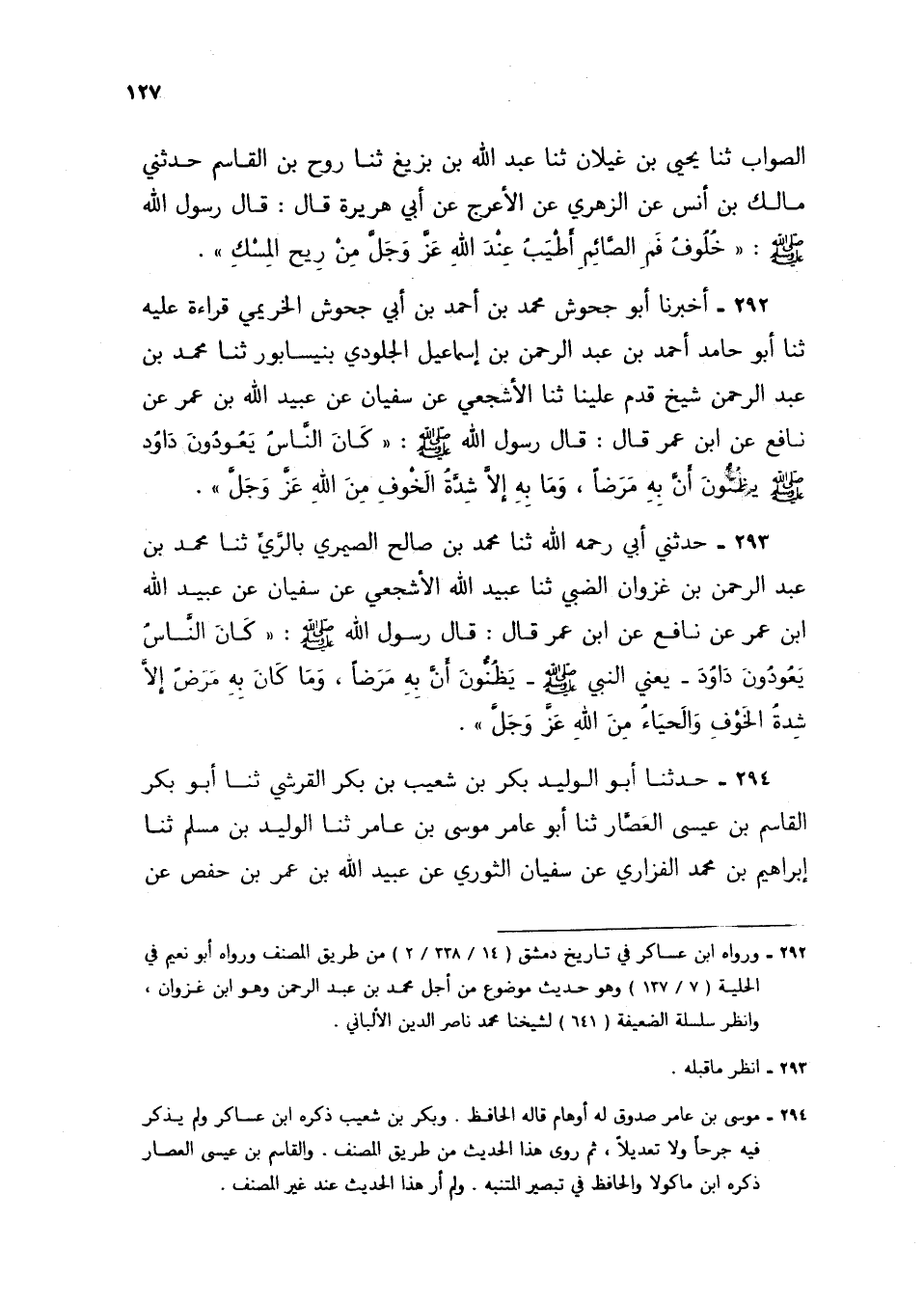 292 - أَخْبَرَنَا أَبُو جَحُوشٍ مُحَمَّدُ بْنُ أَحْمَدَ بْنِ أَبِي جَحُوشٍ الْخُرَيْمِيُّ قِرَاءَةً عَلَيْهِ، ثنا أَبُو حَامِدٍ أَحْمَدُ بْنُ عَبْدِ الرَّحْمَنِ بْنِ إِسْمَاعِيلَ الْجُلُودِيُّ بِنَيْسَابُورَ، ثنا مُحَمَّدُ بْنُ عَبْدِ الرَّحْمَنِ، شَيْخٌ قَدِمَ عَلَيْنَا، ثنا الْأَشْجَعِيُّ، عَنْ سُفْيَانَ، عَنْ عُبَيْدِ اللَّهِ بْنِ عُمَرَ، عَنْ نَافِعٍ، عَنِ ابْنِ عُمَرَ، قَالَ: قَالَ رَسُولُ اللَّهِ صَلَّى اللهُ عَلَيْهِ وَسَلَّمَ: «كَانَ §النَّاسُ يَعُودُونَ دَاوُدَ صَلَّى اللهُ عَلَيْهِ وَسَلَّمَ يَظُنُّونَ أَنَّ بِهِ مَرَضًا وَمَا بِهِ إِلَّا شِدَّةُ الْخَوْفِ مِنَ اللَّهِ عَزَّ وَجَلَّ»