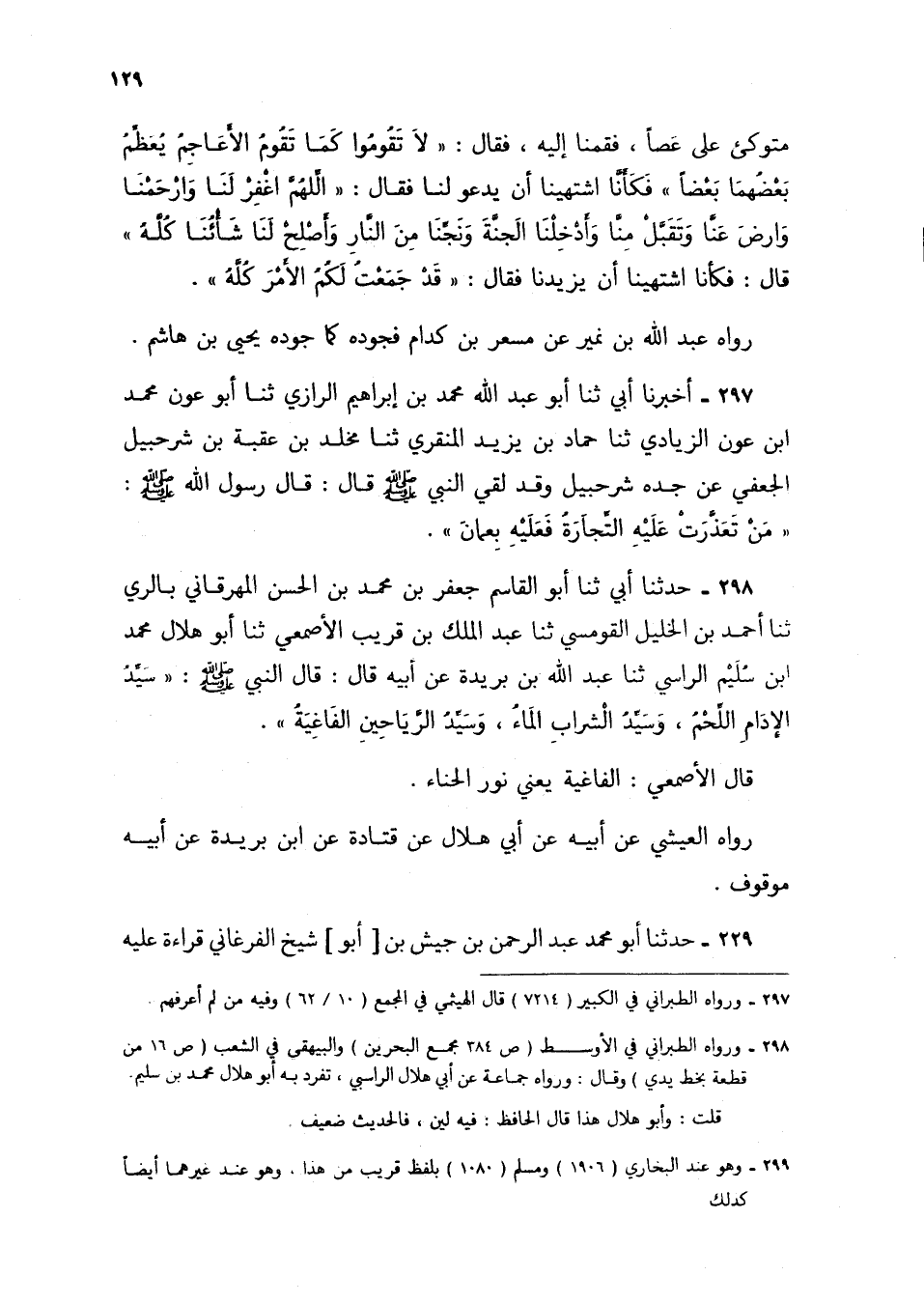 298 - حَدَّثَنَا أَبِي، ثنا أَبُو الْقَاسِمِ جَعْفَرُ بْنُ مُحَمَّدِ بْنِ الْحَسَنِ الْمِهْرِقَانِيُّ بِالرِّيِّ، ثنا أَحْمَدُ بْنُ الْخَلِيلِ الْقُومَسِيُّ، ثنا عَبْدُ الْمَلِكِ بْنُ قَرِيبٍ الْأَصْمَعِيُّ، ثنا أَبُو هِلَالٍ مُحَمَّدُ بْنُ سُلَيْمٍ الرَّاسِيُّ، ثنا عَبْدُ اللَّهِ بْنُ بُرَيْدَةَ، عَنْ أَبِيهِ، قَالَ: قَالَ النَّبِيُّ صَلَّى اللهُ عَلَيْهِ وَسَلَّمَ: «§سَيِّدُ الْإِدَامِ اللَّحْمُ، وَسَيِّدُ الشَّرَابِ الْمَاءُ، وَسَيِّدُ الرَّيَاحِينِ الْفَاغِيَةُ» قَالَ الْأَصْمَعِيُّ: الْفَاغِيَةُ: يَعْنِي نُورَ الْحِنَّاءِ رَوَاهُ الْعَيْشِيُّ، عَنْ أَبِيهِ، عَنْ أَبِي هِلَالٍ، عَنْ قَتَادَةَ، عَنِ ابْنِ بُرَيْدَةَ، عَنْ أَبِيهِ مَوْقُوفٌ