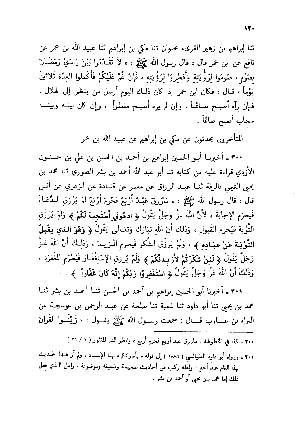 301 - أَخْبَرَنَا أَبُو الْحُسَيْنِ إِبْرَاهِيمُ بْنُ أَحْمَدَ بْنِ الْحَسَنِ، ثنا أَحْمَدُ بْنُ بِشْرٍ، ثنا مُحَمَّدُ بْنُ يَحْيَى، ثنا أَبُو دَاوُدَ، ثنا شُعْبَةُ، ثنا طَلْحَةُ، عَنْ عَبْدِ الرَّحْمَنِ بْنِ عَوْسَجَةَ، عَنِ الْبَرَاءِ بْنِ عَازِبٍ، قَالَ: سَمِعْتُ رَسُولَ اللَّهِ صَلَّى اللهُ عَلَيْهِ وَسَلَّمَ يَقُولُ: §«زَيِّنُوا الْقُرْآنَ -[131]- بِأَصْوَاتِكُمْ وَرَتِّلُوهُ، وَلَا تَهُذُّوا الْقُرْآنَ كَهَذِّ الشِّعْرِ، وَلَا تَنْثُرُوا نَثْرَ الدَّقَلِ، يَنْبَغِي لِلْقَارِئِ أَنْ يَفْهَمَ مَا يَقْرَأُ وَلَتَالِي آيَةٍ مِنْ كِتَابِ اللَّهِ عَزَّ وَجَلَّ أَفْضَلُ مِمَّا تَحْتَ الْعَرْشِ إِلَى تُخُومِ الْأَرَضِينَ السُّفْلَى السَّابِعَةِ، وَمَا تَقَرَّبَ الْمُتَقَرِّبُونَ بِشَيْءٍ أَحَبَّ إِلَى اللَّهِ عَزَّ وَجَلَّ مِمَّا خَرَجَ مِنْهُ، يَعْنِي الْقُرْآنَ، وَمَنْ قَرَأَ الْقُرْآنَ فَرَأَى أَنَّ أَحَدًا أُعْطِيَ أَفْضَلَ مِمَّا أُعْطِيَ فَقَدْ حَقَّرَ مَا عَظَّمَ اللَّهُ عَزَّ وَجَلَّ وَعَظَّمَ مَا حَقَّرَ اللَّهُ عَزَّ وَجَلَّ، وَأَفْضَلُ مَا عُبِدَ اللَّهُ عَزَّ وَجَلَّ بِهِ قِرَاءَةُ الْقُرْآنِ فِي الصَّلَاةِ، وَالْعِبَادَةُ الَّتِي تَلِيهَا قِرَاءَةُ الْقُرْآنِ فِي غَيْرِ صَلَاةٍ، وَمَنْ قَرَأَ مِنَ الْقُرْآنِ فِي يَوْمٍ وَلَيْلَةٍ مِائَتَيْ آيَةٍ نَظَرًا مُتِّعَ بِبَصَرِهِ أَيَّامَ حَيَاتِهِ، وَرُفِعَ لَهُ مِثْلُ مَا فِي الدُّنْيَا مِنْ شَيْءٍ رَطْبٍ وَيَابِسٍ حَسَنَةً، وَالنَّظَرُ فِي الْمُصْحَفِ عِبَادَةٌ، وَمَنْ قَرَأَ الْقُرْآنَ فَكَأَنَّمَا أُدْرِجَتِ النُّبُوَّةُ بَيْنَ جَنْبَيْهِ إِلَّا أَنَّهُ لَا يُوحَى إِلَيْهِ، وَمَنْ قَرَأَ الْقُرْآنَ قَائِمًا، فَلَهُ بِكُلِّ حَرْفٍ مِائَةُ حَسَنَةٍ، وَمَنْ قَرَأَهُ فِي الصَّلَاةِ قَاعِدًا، فَلَهُ بِكُلِّ حَرْفٍ خَمْسُونَ حَسَنَةً، وَمَنْ قَرَأَ فِي غَيْرِ صَلَاةٍ فَلَهُ بِكُلِّ حَرْفٍ عَشَرُ حَسَنَاتٍ، وَمَنِ اسْتَمَعَ إِلَيْهَا فَلَهُ بِكُلِّ حَرْفٍ حَسَنَةٌ، وَمَنْ قَرَأَ الْقُرْآنَ فَأَعْرَبَهُ، فَلَهُ بِكُلِّ حَرْفٍ أَرْبَعُونَ حَسَنَةً، وَمَنْ قَرَأَ الْقُرْآنَ بِلَحْنٍ وَتَطْرِيبٍ فَلَهُ بِكُلِّ حَرْفٍ عِشْرُونَ حَسَنَةً، وَمَنْ قَرَأَ الْقُرْآنَ كَقِرَاءَةِ الْعَامَّةِ فَلَهُ بِكُلِّ حَرْفٍ عَشَرُ حَسَنَاتٍ، وَالْعَجَمُ يَقْرَأُ الْقُرْآنَ غَضًّا كَمَا نَزَلَ، وَالْقُرْآنُ أُنْزِلَ عَلَى سَبْعَةِ أَحْرُفٍ فَاقْرَءُوهُ وَتَعَاهَدُوهُ وَاقْتَنُوهُ وَتَغَنَّوْا بِهِ فَوَالَّذِي نَفْسِي بِيَدِهِ لَهُوَ أَشَدُّ تَفَلُّتًا مِنْ صُدُورِ الرِّجَالِ مِنَ الْمَخَاضِ فِي الْعُقُلِ» ثُمَّ قَرَأَ {يُؤْتِي الْحِكْمَةَ مَنْ يَشَاءُ وَمَنْ يُؤْتَ الْحِكْمَةَ فَقَدْ أُوتِيَ خَيْرًا كَثِيرًا} [البقرة: 269] «فَالْكَثِيرُ مِنَ اللَّهِ عَزَّ وَجَلَّ مَا لَا يُحْصِيهِ إِلَّا اللَّهُ عَزَّ وَجَلَّ الْوَاحِدُ الْقَهَّارُ» وَقَالَ رَسُولُ اللَّهِ صَلَّى اللهُ عَلَيْهِ وَسَلَّمَ: «وَمَنْ قَرَأَ مِائَةَ آيَةٍ كُتِبَ مِنَ الْقَانِتِينَ، وَمَنْ قَرَأَ مِائَتَيْ آيَةٍ لَمْ يُحَاجِّهِ الْقُرْآنُ يَوْمَ الْقِيَامَةِ، وَمَنْ قَرَأَ خَمْسَمِائَةً كُتِبَ لَهُ -[132]- قِنْطَارٌ مِنَ الْأَجْرِ»