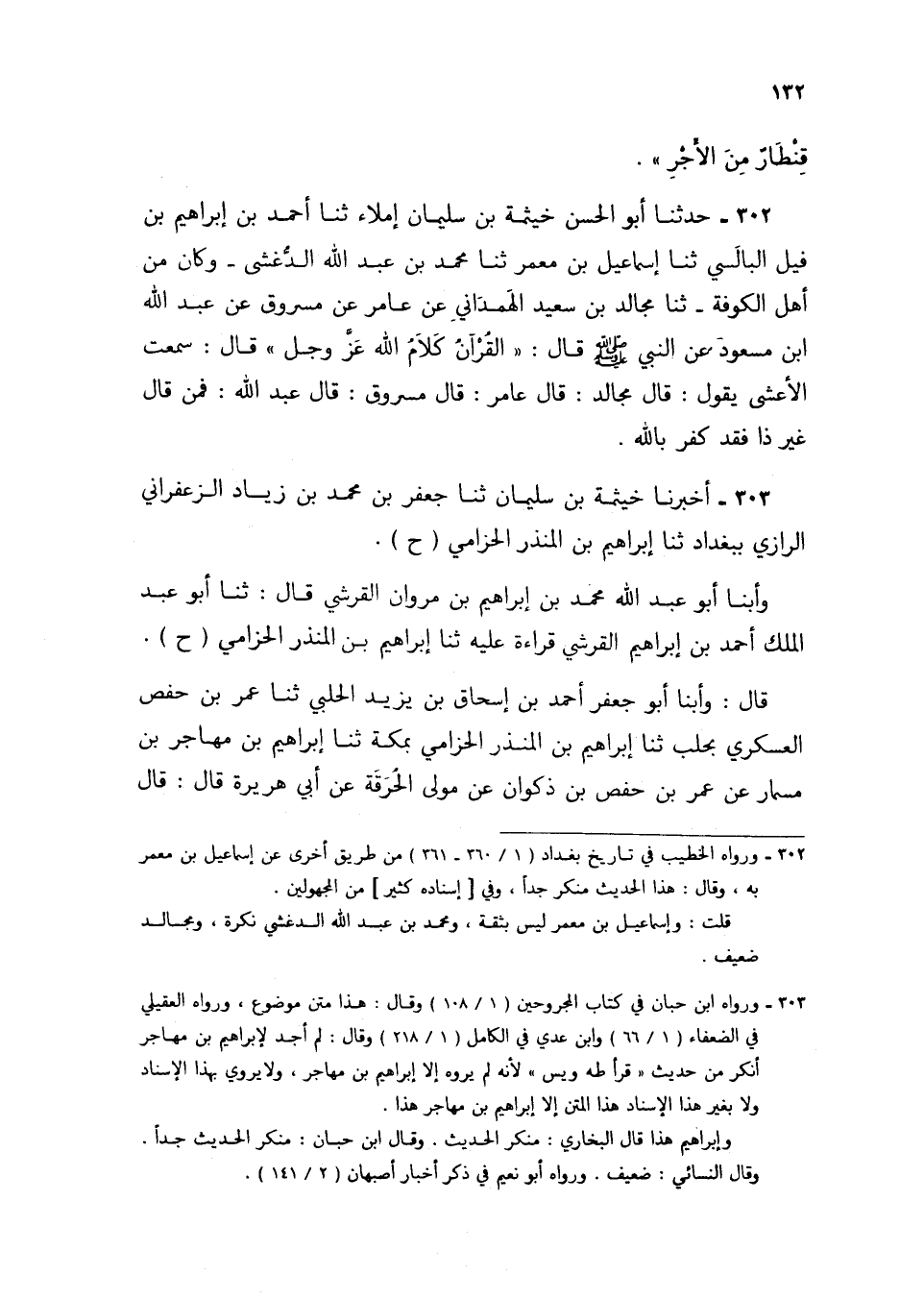 302 - حَدَّثَنَا أَبُو الْحَسَنِ خَيْثَمَةُ بْنُ سُلَيْمَانَ إِمْلَاءً، ثنا أَحْمَدُ بْنُ إِبْرَاهِيمَ بْنِ فِيلٍ الْبَالِسِيُّ، ثنا إِسْمَاعِيلُ بْنُ مَعْمَرٍ، ثنا مُحَمَّدُ بْنُ عَبْدِ اللَّهِ الدَّغْشِيُّ وَكَانَ مِنْ أَهْلِ الْكُوفَةِ، ثنا مُجَالِدُ بْنُ سَعِيدٍ الْهَمْدَانِيُّ، عَنْ عَامِرٍ، عَنْ مَسْرُوقٍ، عَنْ عَبْدِ اللَّهِ بْنِ مَسْعُودٍ، عَنِ النَّبِيِّ صَلَّى اللهُ عَلَيْهِ وَسَلَّمَ قَالَ: «§الْقُرْآنُ كَلَامُ اللَّهِ عَزَّ وَجَلَّ» قَالَ: سَمِعْتُ الْأَعْشَى يَقُولُ: قَالَ مُجَالِدٌ: قَالَ عَامِرٌ: قَالَ مَسْرُوقٌ: قَالَ عَبْدُ اللَّهِ: «فَمَنْ قَالَ غَيْرَ ذَا فَقَدْ كَفَرَ بِاللَّهِ»