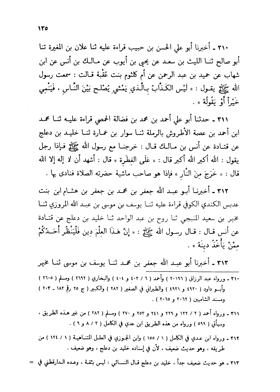 312 - أَخْبَرَنَا أَبُو عَبْدِ اللَّهِ جَعْفَرُ بْنُ مُحَمَّدِ بْنِ جَعْفَرِ بْنِ هِشَامٍ ابْنِ بِنْتِ عَدَبَّسٍ الْكِنْدِيُّ الْكُوفِيُّ قِرَاءَةً عَلَيْهِ، ثنا يُوسُفُ بْنُ مُوسَى بْنِ عَبْدِ اللَّهِ الْمَرْوَزِيُّ، ثنا مُخَيْمَرُ بْنُ سَعِيدٍ الْمَنْبِجِيُّ، ثنا رَوْحُ بْنُ عَبْدِ الْوَاحِدِ، ثنا خُلَيْدُ بْنُ دَعْلَجٍ، عَنْ قَتَادَةَ، عَنْ أَنَسٍ، قَالَ: قَالَ رَسُولُ اللَّهِ صَلَّى اللهُ عَلَيْهِ وَسَلَّمَ: «إِنَّ §هَذَا الْعِلْمَ دِينٌ، فَلْيَنْظُرْ أَحَدُكُمْ مِمَّنْ يَأْخُذُ دِينَهُ»