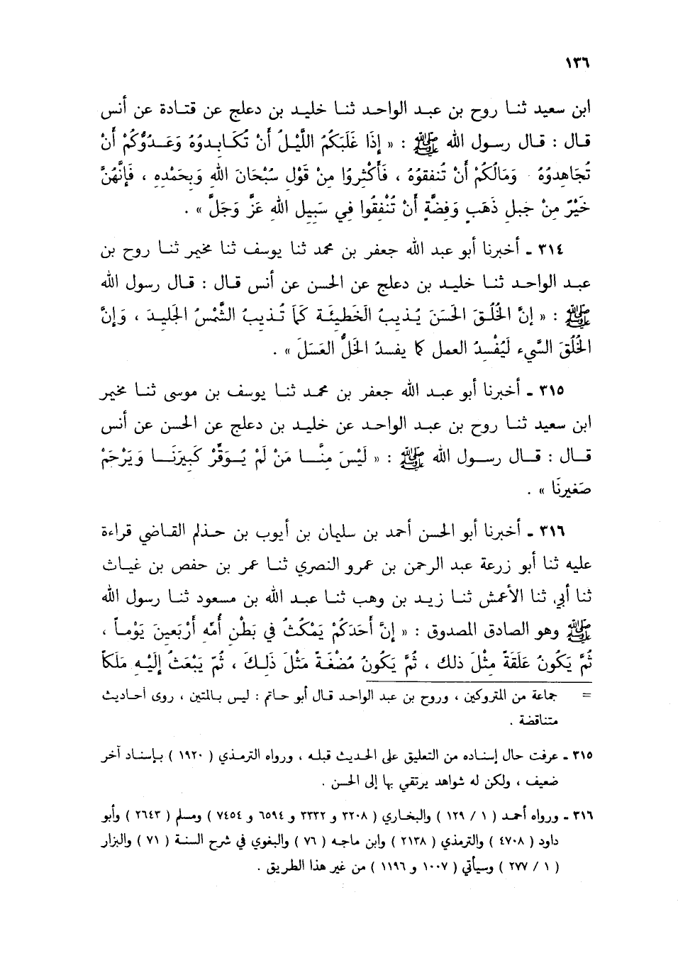 315 - أَخْبَرَنَا أَبُو عَبْدِ اللَّهِ جَعْفَرُ بْنُ مُحَمَّدٍ، ثنا يُوسُفُ بْنُ مُوسَى، ثنا مُخَيْمَرُ بْنُ سَعِيدٍ، ثنا رَوْحُ بْنُ عَبْدِ الْوَاحِدِ، عَنْ خُلَيْدِ بْنِ دَعْلَجٍ، عَنِ الْحَسَنِ، عَنْ أَنَسٍ، قَالَ: قَالَ رَسُولُ اللَّهِ صَلَّى اللهُ عَلَيْهِ وَسَلَّمَ: «§لَيْسَ مِنَّا مَنْ لَمْ يُوَقِّرْ كَبِيرَنَا، وَيَرْحَمْ صَغِيرَنَا»