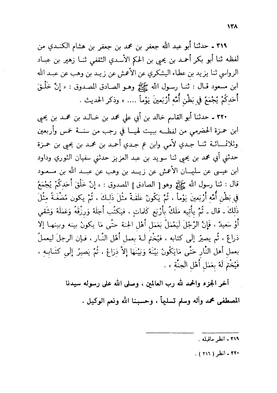 320 - حَدَّثَنَا أَبُو الْقَاسِمِ خَالِدُ بْنُ أَبِي عَلِيٍّ مُحَمَّدِ بْنِ خَالِدِ بْنِ مُحَمَّدِ بْنِ يَحْيَى بْنِ حَمْزَةَ الْحَضْرَمِيُّ مِنْ لَفْظِهِ بِبَيْتِ لَهْيَا فِي رَجَبٍ مِنْ سَنَةِ خَمْسٍ وَأَرْبَعِينَ وَثَلَاثِمِائَةٍ، ثنا جَدِّي لِأُمِّي، وَابْنُ عَمِّ جَدِّي أَحْمَدُ بْنُ مُحَمَّدِ بْنِ يَحْيَى بْنِ حَمْزَةَ، حَدَّثَنِي أَبِي مُحَمَّدُ بْنُ يَحْيَى، ثنا سُوَيْدُ بْنُ عَبْدِ الْعَزِيزِ، حَدَّثَنِي سُفْيَانُ الثَّوْرِيُّ، وَدَاوُدُ بْنُ عِيسَى، عَنْ سُلَيْمَانَ الْأَعْمَشِ، عَنْ زَيْدِ بْنِ وَهْبٍ، عَنْ عَبْدِ اللَّهِ بْنِ مَسْعُودٍ، قَالَ: ثنا رَسُولُ اللَّهِ صَلَّى اللهُ عَلَيْهِ وَسَلَّمَ وَهُوَ الصَّادِقُ الْمَصْدُوقُ: «إِنَّ §خَلْقَ أَحَدِكُمْ يُجْمَعُ فِي بَطْنِ أُمِّهِ أَرْبَعِينَ يَوْمًا، ثُمَّ يَكُونُ عَلَقَةً مِثْلَ ذَلِكَ، ثُمَّ يَكُونُ مُضْغَةً مِثْلَ ذَلِكَ» قَالَ: «ثُمَّ يَأْتِيهِ مَلَكٌ بِأَرْبَعِ كَلِمَاتٍ فَيَكْتُبُ أَجَلَهُ وَرِزْقَهُ وَعَمَلَهُ وَشَقِيُّ أَوْ سَعِيدٌ، فَإِنَّ الرَّجُلَ لَيَعْمَلُ بِعَمَلِ أَهْلِ الْجَنَّةِ حَتَّى مَا يَكُونَ بَيْنَهُ وَبَيْنَهَا إِلَّا ذِرَاعٌ، ثُمَّ يَصِيرُ إِلَى كِتَابِهِ فَيُخْتَمُ لَهُ بِعَمَلِ أَهْلِ النَّارِ، وَإِنَّ الرَّجُلَ لَيَعْمَلُ بِعَمَلِ أَهْلِ النَّارِ حَتَّى مَا يَكُونَ بَيْنَهُ وَبَيْنَهَا إِلَّا ذِرَاعٌ، ثُمَّ يَصِيرُ إِلَى كِتَابِهِ فَيُخْتَمُ لَهُ بِعَمَلِ أَهْلِ الْجَنَّةِ»