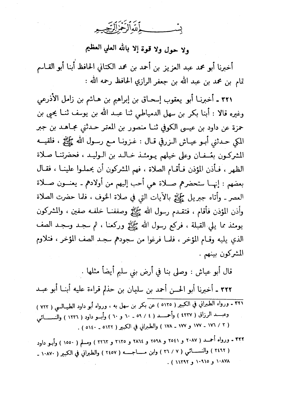 321 - أَخْبَرَنَا أَبُو يَعْقُوبَ إِسْحَاقُ بْنُ إِبْرَاهِيمَ بْنِ هَاشِمِ بْنِ زَامِلٍ الْأَذْرَعِيُّ، وَغَيْرُهُ قَالَا: أبنا بَكْرُ بْنُ سَهْلٍ الدِّمْيَاطِيُّ، ثنا عَبْدُ اللَّهِ بْنُ يُوسُفَ، ثنا يَحْيَى بْنُ حَمْزَةَ، عَنْ دَاوُدَ بْنِ عِيسَى الْكُوفِيِّ، ثنا مَنْصُورُ بْنُ الْمُعْتَمِرِ، حَدَّثَنِي مُجَاهِدُ بْنُ جَبْرٍ الْمَكِّيُّ، حَدَّثَنِي أَبُو عَيَّاشٍ الزُّرَقِيُّ، قَالَ: §" غَزَوْنَا مَعَ رَسُولِ اللَّهِ صَلَّى اللهُ عَلَيْهِ وَسَلَّمَ فَلَقِيَهُ الْمُشْرِكُونَ بِعُسْفَانَ وَعَلَى خَيْلِهِمْ يَوْمَئِذٍ خَالِدُ بْنُ الْوَلِيدِ، فَحَضَرَتْنَا صَلَاةُ الظُّهْرِ فَأَذَّنَ الْمُؤَذِّنُ فَأَقَامَ الصَّلَاةَ، فَهَمَّ الْمُشْرِكُونَ أَنْ يَحْمِلُوا عَلَيْنَا، فَقَالَ بَعْضُهُمْ: إِنَّهَا سَتَحْضُرُهُمْ صَلَاةٌ هِيَ أَحَبُّ إِلَيْهِمْ مِنْ أَوْلَادِهِمْ، يَعْنُونَ صَلَاةَ الْعَصْرِ، وَأَتَاهُ جِبْرِيلُ صَلَّى اللهُ عَلَيْهِ وَسَلَّمَ بِالْآيَاتِ الَّتِي فِي صَلَاةِ الْخَوْفِ، فَلَمَّا حَضَرَتِ الصَّلَاةُ وَأَذَّنَ الْمُؤَذِّنُ، فَأَقَامَ فَتَقَدَّمَ رَسُولُ اللَّهِ صَلَّى اللهُ عَلَيْهِ وَسَلَّمَ وَصَفَفْنَا خَلْفَهُ صَفَّيْنِ، وَالْمُشْرِكُونَ يَوْمَئِذٍ مِمَّا يَلِي الْقِبْلَةَ، فَرَكَعَ رَسُولُ اللَّهِ صَلَّى اللهُ عَلَيْهِ وَسَلَّمَ وَرَكَعْنَا، ثُمَّ سَجَدَ وَسَجَدَ الصَّفُّ الَّذِي يَلِيهِ وَقَامَ الْمُؤَخَّرُ، فَلَمَّا فَرَغُوا مِنْ سُجُودِهِمْ سَجَدَ الصَّفُّ الْمُؤَخَّرُ، فَتَلَاوَمَ الْمُشْرِكُونَ بَيْنَهُمْ " قَالَ أَبُو عَيَّاشٍ: «وَصَلَّى بِنَا فِي أَرْضِ بَنِي سُلَيْمٍ أَيْضًا مِثْلَهَا»