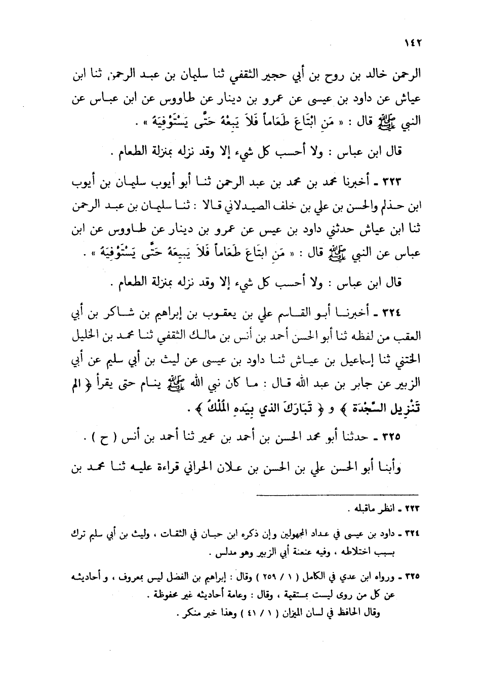 323 - أَخْبَرَنَا مُحَمَّدُ بْنُ مُحَمَّدِ بْنِ عَبْدِ الرَّحْمَنِ، ثنا أَبُو أَيُّوبَ سُلَيْمَانُ بْنُ أَيُّوبَ بْنِ حَذْلَمٍ، وَالْحَسَنُ بْنُ عَلِيِّ بْنِ خَلَفٍ الصَّيْدَلَانِيُّ، قَالَا: ثنا سُلَيْمَانُ بْنُ عَبْدِ الرَّحْمَنِ، ثنا ابْنُ عَيَّاشٍ، حَدَّثَنِي دَاوُدُ بْنُ عِيسَى، عَنْ عَمْرِو بْنِ دِينَارٍ، عَنْ طَاوُسٍ، عَنِ ابْنِ عَبَّاسٍ عَنِ النَّبِيِّ صَلَّى اللهُ عَلَيْهِ وَسَلَّمَ قَالَ: §«مَنِ ابْتَاعَ طَعَامًا فَلَا يَبِعْهُ حَتَّى يَسْتَوْفِيَهُ» قَالَ ابْنُ عَبَّاسٍ: «وَلَا أَحْسَبُ كُلَّ شَيْءٍ إِلَّا وَقَدْ نَزَّلَهُ بِمَنْزِلَةِ الطَّعَامِ»