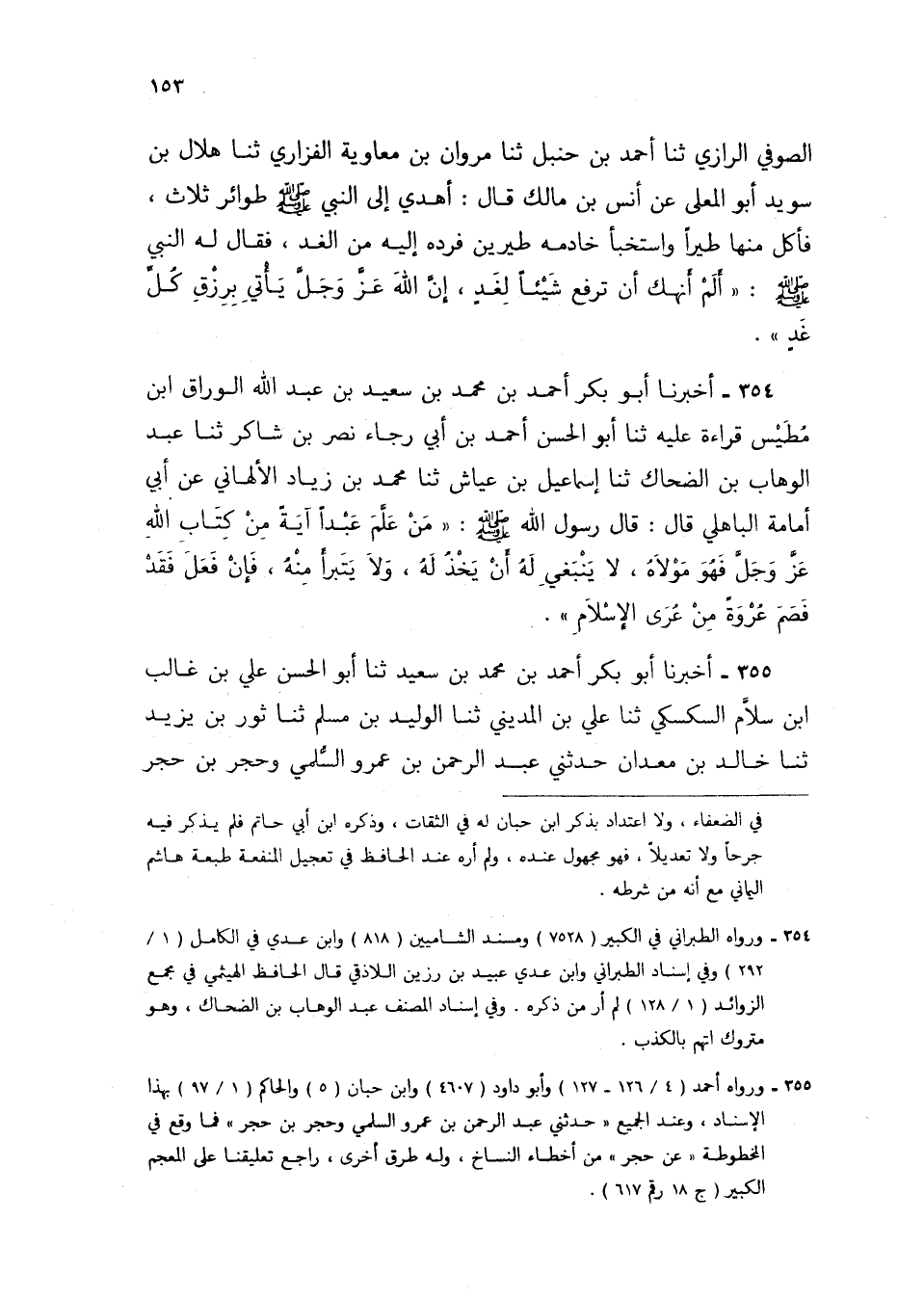 355 - أَخْبَرَنَا أَبُو بَكْرٍ أَحْمَدُ بْنُ مُحَمَّدِ بْنِ سَعِيدٍ، ثنا أَبُو الْحَسَنِ عَلِيُّ بْنُ غَالِبِ بْنِ سَلَّامٍ السَّكْسَكِيُّ، ثنا عَلِيُّ بْنُ الْمَدِينِيِّ، ثنا الْوَلِيدُ بْنُ مُسْلِمٍ، ثنا ثَوْرُ بْنُ يَزِيدَ، ثنا خَالِدُ بْنُ مَعْدَانَ، حَدَّثَنِي عَبْدُ الرَّحْمَنِ بْنُ عَمْرٍو السُّلَمِيُّ، وَحُجْرُ بْنُ حُجْرٍ -[154]- الْكَلَاعِيُّ، قَالَ: أَتَيْنَا الْعِرْبَاضَ بْنَ سَارِيَةَ وَهُوَ مِنَ الَّذِينَ أُنْزِلَ فِيهِمُ {الَّذِينَ إِذَا مَا أَتَوْكَ لِتَحْمِلَهُمْ قُلْتَ لَا أَجِدُ مَا أَحْمِلُكُمْ عَلَيْهِ} [التوبة: 92] قَالَ: فَقُلْنَا: أَتَيْنَاكَ زَائِرِينَ وَعَائِدِينَ وَمُقْتَبِسِينَ، قَالَ الْعِرْبَاضُ: صَلَّى بِنَا رَسُولُ اللَّهِ صَلَّى اللهُ عَلَيْهِ وَسَلَّمَ الصُّبْحَ ذَاتَ يَوْمٍ فَوَعَظَنَا مَوْعِظَةً ذَرَفَتْ مِنْهَا الْعُيُونُ، وَوَجِلَتْ مِنْهَا الْقُلُوبُ، قَالَ: فَقُلْنَا: يَا رَسُولَ اللَّهِ كَأَنَّ هَذَا مَوْعِظَةُ مُوَدِّعٍ فَمَاذَا تَعْهَدُ إِلَيْنَا؟ قَالَ: «§أُوصِيكُمْ بِتَقْوَى اللَّهِ عَزَّ وَجَلَّ، وَالسَّمْعِ وَالطَّاعَةِ، وَإِنْ عَبْدًا حَبَشِيًّا، وَعَلَيْكُمْ بِسُنَّتِي وَسُنَّةِ الْخُلَفَاءِ الْمَهْدِيِّينَ، فَتَمَسَّكُوا بِهَا وَعَضُّوا عَلَيْهَا بِالنَّوَاجِذِ، وَإِيَّاكُمْ وَكُلَّ مُحْدَثَةٍ، فَإِنَّ كُلَّ مُحْدَثَةٍ بِدْعَةٌ، وَكُلَّ بِدْعَةٍ ضَلَالَةٌ» قَالَ الْوَلِيدُ: فَذَكَرْتُ هَذَا الْحَدِيثَ لِعَبْدِ اللَّهِ بْنِ الْعَلَاءِ، فَقَالَ: حَدَّثَنِي بِهِ يَحْيَى بْنُ أَبِي الْمُطَاعِ الْقُرَشِيُّ أَنَّهُ سَمِعَهُ مِنَ الْعِرْبَاضِ بْنِ سَارِيَةَ هَكَذَا كَانَ فِي كِتَابِ أَبِي بَكْرٍ وَقَدْ رَوَاهُ جَمَاعَةٌ عَنِ الْوَلِيدِ بْنِ مُسْلِمٍ بِإِسْنَادِهِ عَنْ عَبْدِ الرَّحْمَنِ بْنِ عَمْرٍو السُّلَمِيِّ، وَحُجْرِ بْنِ حُجْرٍ، قَالَا: أَتَيْنَا الْعِرْبَاضَ بْنَ سَارِيَةَ