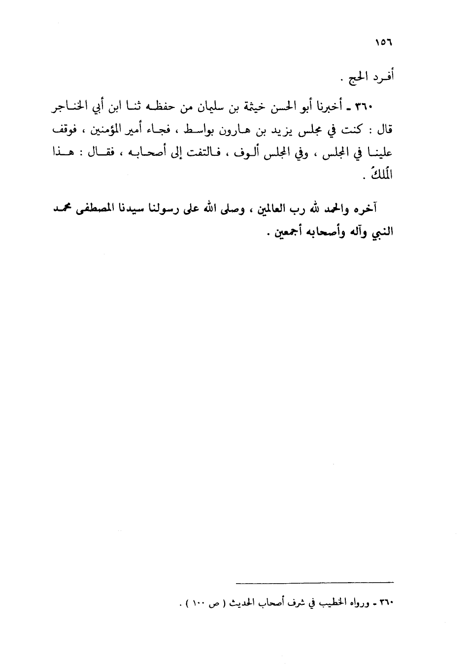 360 - أَخْبَرَنَا أَبُو الْحَسَنِ خَيْثَمَةُ بْنُ سُلَيْمَانَ مِنْ حِفْظِهِ، ثنا ابْنُ أَبِي الْخَنَاجِرِ، قَالَ: " كُنْتُ فِي مَجْلِسِ يَزِيدَ بْنِ هَارُونَ بِوَاسِطَ، فَجَاءَ أَمِيرُ الْمُؤْمِنِينَ §فَوَقَفَ عَلَيْنَا فِي الْمَجْلِسِ وَفِي الْمَجْلِسِ أُلُوفٌ، فَالْتَفَتَ إِلَى أَصْحَابِهِ فَقَالَ: هَذَا الْمُلْكُ "