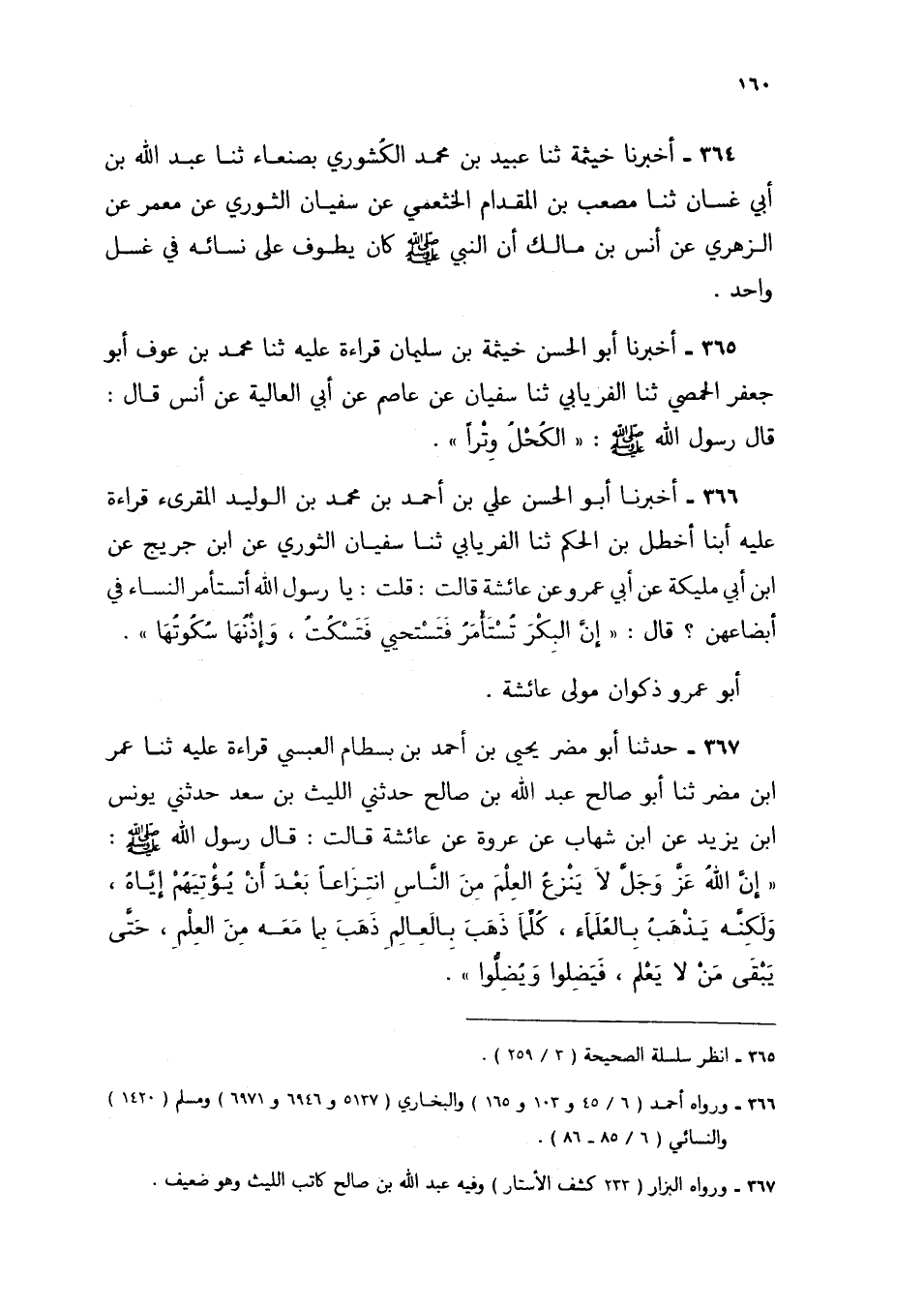 367 - حَدَّثَنَا أَبُو مُضَرَ يَحْيَى بْنُ أَحْمَدَ بْنِ بِسْطَامٍ الْعَبْسِيُّ قِرَاءَةً عَلَيْهِ، ثنا عُمَرُ بْنُ مُضَرَ، ثنا أَبُو صَالِحٍ عَبْدُ اللَّهِ بْنُ صَالِحٍ، حَدَّثَنِي اللَّيْثُ بْنُ سَعْدٍ، حَدَّثَنِي يُونُسُ بْنُ يَزِيدَ، عَنِ ابْنِ شِهَابٍ، عَنْ عُرْوَةَ، عَنْ عَائِشَةَ، قَالَتْ: قَالَ رَسُولُ اللَّهِ صَلَّى اللهُ عَلَيْهِ وَسَلَّمَ: «إِنَّ §اللَّهَ عَزَّ وَجَلَّ لَا يَنْزِعُ الْعِلْمَ مِنَ النَّاسِ انْتِزَاعًا بَعْدَ أَنْ يُؤْتِيَهُمْ إِيَّاهُ، وَلَكِنَّهُ يَذْهَبُ بِالْعُلَمَاءِ، كُلَّمَا ذَهَبَ بِالْعَالِمِ ذَهَبَ بِمَا مَعَهُ مِنَ الْعِلْمِ، حَتَّى يَبْقَى مَنْ لَا يَعْلَمُ فَيَضِلُّوا وَيُضِلُّوا»