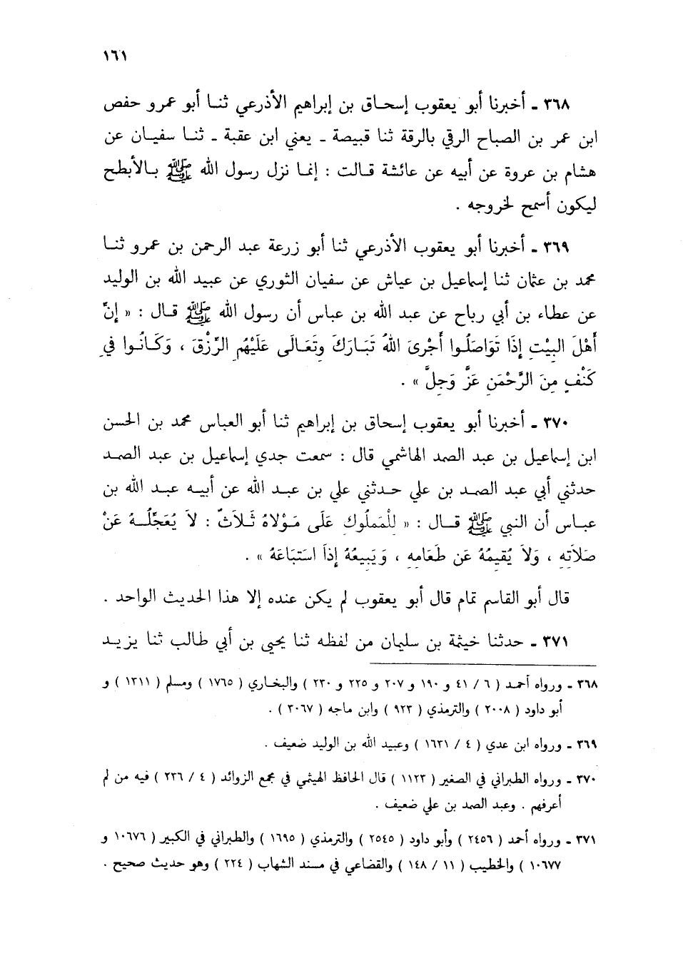 370 - أَخْبَرَنَا أَبُو يَعْقُوبَ إِسْحَاقُ بْنُ إِبْرَاهِيمَ، ثنا أَبُو الْعَبَّاسِ مُحَمَّدُ بْنُ الْحَسَنِ بْنِ إِسْمَاعِيلَ بْنِ عَبْدِ الصَّمَدِ الْهَاشِمِيُّ، قَالَ: سَمِعْتُ جَدِّيَ إِسْمَاعِيلَ بْنَ عَبْدِ الصَّمَدِ، حَدَّثَنِي أَبِي عَبْدُ الصَّمَدِ بْنُ عَلِيٍّ، حَدَّثَنِي عَلِيُّ بْنُ عَبْدِ اللَّهِ، عَنْ أَبِيهِ عَبْدِ اللَّهِ بْنِ عَبَّاسٍ، أَنَّ النَّبِيَّ صَلَّى اللهُ عَلَيْهِ وَسَلَّمَ قَالَ: «§لِلْمَمْلُوكِ عَلَى مَوْلَاهُ ثَلَاثٌ، لَا يُعَجِّلُهُ عَنْ صَلَاتِهِ وَلَا يُقِيمُهُ عَنْ طَعَامِهِ، وَيَبِيعُهُ إِذَا اسْتَبَاعَهُ» قَالَ أَبُو الْقَاسِمِ تَمَّامٌ: قَالَ أَبُو يَعْقُوبَ لَمْ يَكُنْ عِنْدَهُ إِلَّا هَذَا الْحَدِيثُ الْوَاحِدُ