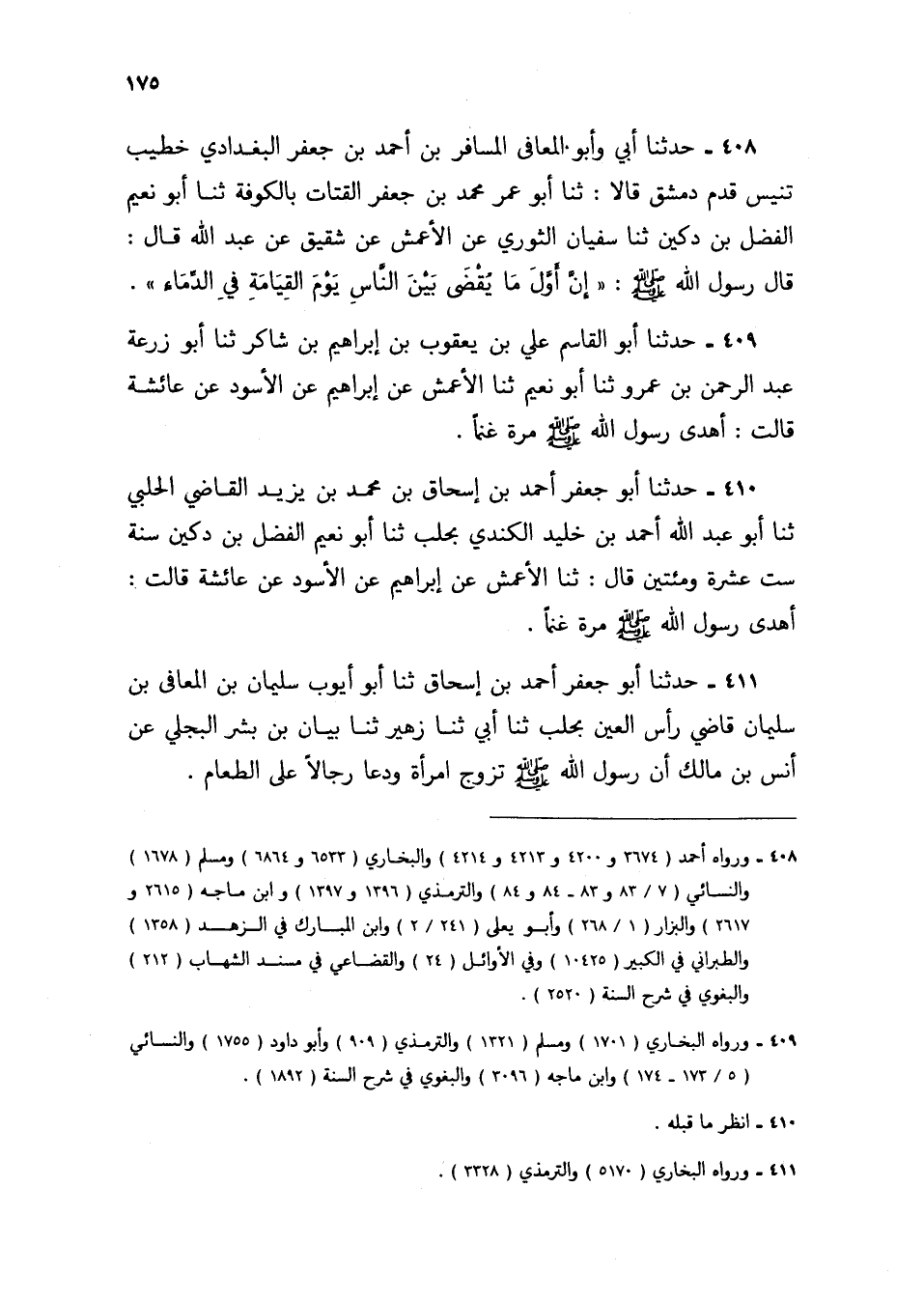 410 - حَدَّثَنَا أَبُو جَعْفَرٍ أَحْمَدُ بْنُ إِسْحَاقَ بْنِ مُحَمَّدِ بْنِ يَزِيدَ الْقَاضِي الْحَلَبِيُّ، ثنا أَبُو عَبْدِ اللَّهِ أَحْمَدُ بْنُ خُلَيْدٍ الْكِنْدِيُّ بِحَلَبَ، ثنا أَبُو نُعَيْمٍ الْفَضْلُ بْنُ دُكَيْنٍ، سَنَةَ سِتَّ عَشْرَةَ وَمِائَتَيْنِ قَالَ: ثنا الْأَعْمَشُ، عَنْ إِبْرَاهِيمَ، عَنِ الْأَسْوَدِ، عَنْ عَائِشَةَ، قَالَتْ: §«أُهْدِيَ رَسُولُ اللَّهِ صَلَّى اللهُ عَلَيْهِ وَسَلَّمَ مَرَّةً غَنَمًا»