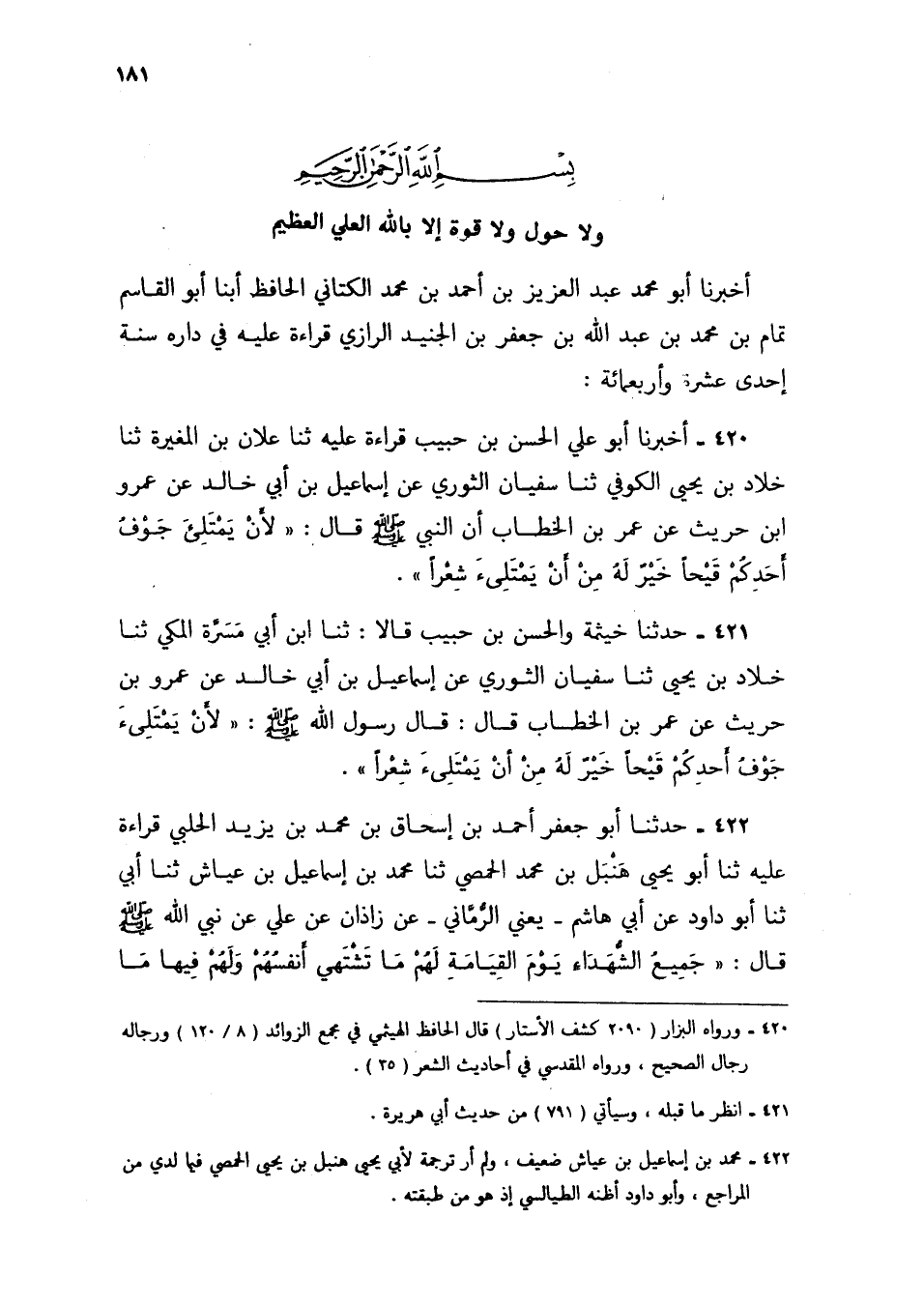 420 - أَخْبَرَنَا أَبُو عَلِيٍّ الْحَسَنُ بْنُ حَبِيبٍ، قِرَاءَةً عَلَيْهِ، ثنا عَلَّانُ بْنُ الْمُغِيرَةِ، ثنا خَلَّادُ بْنُ يَحْيَى الْكُوفِيُّ، ثنا سُفْيَانُ الثَّوْرِيُّ، عَنْ إِسْمَاعِيلَ بْنِ أَبِي خَالِدٍ، عَنْ عَمْرِو بْنِ حُرَيْثٍ، عَنْ عُمَرَ بْنِ الْخَطَّابِ، أَنَّ النَّبِيَّ صَلَّى اللهُ عَلَيْهِ وَسَلَّمَ قَالَ: «§لِأَنْ يَمْتَلِئَ جَوْفُ أَحَدِكُمْ قَيْحًا، خَيْرٌ لَهُ مِنْ أَنْ يَمْتَلِئَ شِعْرًا»