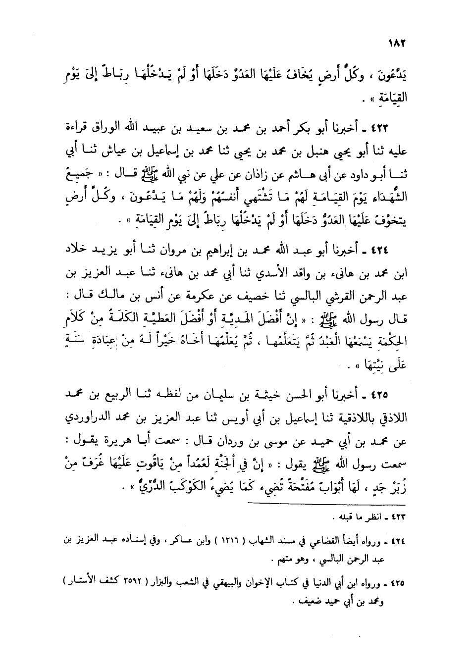 423 - أَخْبَرَنَا أَبُو بَكْرٍ أَحْمَدُ بْنُ مُحَمَّدِ بْنِ سَعِيدِ بْنِ عُبَيْدِ اللَّهِ الْوَرَّاقُ قِرَاءَةً عَلَيْهِ، ثنا أَبُو يَحْيَى هَنْبَلُ بْنُ مُحَمَّدِ بْنِ يَحْيَى، ثنا مُحَمَّدُ بْنُ إِسْمَاعِيلَ بْنِ عَيَّاشٍ، ثنا أَبِي، ثنا أَبُو دَاوُدَ، عَنْ أَبِي هَاشِمٍ، عَنْ زَادَانَ، عَنْ عَلِيٍّ، عَنْ نَبِيِّ اللَّهِ صَلَّى اللهُ عَلَيْهِ وَسَلَّمَ قَالَ: §«جَمِيعُ الشُّهَدَاءِ يَوْمَ الْقِيَامَةِ لَهُمْ مَا تَشْتَهِي أَنْفُسُهُمْ وَلَهُمْ مَا يَدَّعُونَ، وَكُلُّ أَرْضٍ يُتَخَوَّفُ عَلَيْهَا الْعَدُوُّ دَخَلَهَا أَوْ لَمْ يَدْخُلْهَا رِبَاطٌ إِلَى يَوْمِ الْقِيَامَةِ»