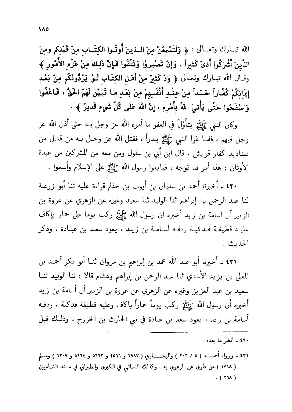 431 - أَخْبَرَنَا أَبُو عَبْدِ اللَّهِ مُحَمَّدُ بْنُ إِبْرَاهِيمَ بْنِ مَرْوَانَ، ثنا أَبُو بَكْرٍ أَحْمَدُ بْنُ الْمُعَلَّى بْنِ يَزِيدَ الْأَسَدِيُّ، ثنا عَبْدُ الرَّحْمَنِ بْنُ إِبْرَاهِيمَ، وَهِشَامٌ، قَالَا: ثنا الْوَلِيدُ، ثنا سَعِيدُ بْنُ عَبْدِ الْعَزِيزِ، وَغَيْرُهُ، عَنِ الزُّهْرِيِّ، عَنْ عُرْوَةَ بْنِ الزُّبَيْرِ، أَنَّ أُسَامَةَ بْنَ زَيْدٍ، أَخْبَرَهُ، أَنَّ رَسُولَ اللَّهِ صَلَّى اللهُ عَلَيْهِ وَسَلَّمَ رَكِبَ يَوْمًا حِمَارًا بِإِكَافٍ وَعَلَيْهِ قَطِيفَةٌ، فَدَكِيَّةٌ، رِدْفُهُ أُسَامَةُ بْنُ زَيْدٍ يَعُودُ سَعْدَ بْنَ عُبَادَةَ فِي بَنِي الْحَارِثِ بْنِ الْخَزْرَجِ وَذَلِكَ قَبْلَ -[186]- وَقْعَةِ بَدْرٍ، فَمَرَّ عَلَى عَبْدِ اللَّهِ بْنِ أُبَيٍّ، ابْنِ سَلُولَ قَبْلَ إِسْلَامِهِ، وَفِي الْمَجْلِسِ أَخْلَاطٌ مِنَ الْمُسْلِمِينَ وَالْمُشْرِكِينَ مِنَ الْيَهُودِ وَعَابِدَةِ الْأَوْثَانِ، فَلَمَّا غَشِيَتِ الْمَجْلِسَ عَجَاجَةُ الدَّابَّةِ خَمَّرَ ابْنُ أُبَيٍّ أَنْفَهُ بِرِدَائِهِ، ثُمَّ قَالَ: لَا تُغَبِّرُوا عَلَيْنَا، فَسَلَّمَ عَلَيْهِمْ رَسُولُ اللَّهِ صَلَّى اللهُ عَلَيْهِ وَسَلَّمَ ثُمَّ وَقَفَ، §فَدَعَاهُمْ إِلَى اللَّهِ عَزَّ وَجَلَّ، وَقَرَأَ عَلَيْهِمُ الْقُرْآنَ، فَقَالَ ابْنُ أُبَيٍّ: أَيُّهَا الْمَرْءُ إِنَّهُ لَا أَحْسَنَ مِمَّا تَقُولُ، فَلَا تُؤْذِنَا فِي مَجَالِسِنَا وَارْجِعْ إِلَى رَحْلِكَ، فَمَنْ جَاءَكَ فَاقْصُصْ عَلَيْهِ، فَقَالَ عَبْدُ اللَّهِ بْنُ رَوَاحَةَ: بَلَى، يَا رَسُولَ اللَّهِ اغْشَنَا فِي مَجْلِسِنَا، فَإِنَّا نُحِبُّ ذَلِكَ، فَاسْتَبَّ الْمُسْلِمُونَ وَالْمُشْرِكُونَ وَالْيَهُودُ حَتَّى كَادُوا يَقْتَتِلُونَ، فَخَفَّضَهُمْ رَسُولُ اللَّهِ صَلَّى اللهُ عَلَيْهِ وَسَلَّمَ حَتَّى سَكَتُوا، وَسَارَ حَتَّى دَخَلَ عَلَى سَعْدِ بْنِ عُبَادَةَ فَقَالَ: «أَيْ سَعْدُ أَلَمْ تَسْمَعْ مَا قَالَ أَبُو الْحُبَابِ؟» وَخَبَّرَهُ مَا كَانَ فَقَالَ سَعْدٌ: يَا رَسُولَ اللَّهِ اعْفُ عَنْهُ وَاصْفَحْ، فَوَالَّذِي أَنْزَلَ عَلَيْكَ الْكِتَابَ، لَقَدْ جَاءَكَ اللَّهُ عَزَّ وَجَلَّ بِالْحَقِّ الَّذِي أَنْزَلَهُ عَلَيْكَ، وَقَدِ اصْطَلَحَ أَهْلُ هَذِهِ الْبَحْرَةِ أَنْ يُتَوِّجُوهُ وَيُعَصِّبُوهُ بِالْعِصَابَةِ، فَرَدَّ اللَّهُ عَزَّ وَجَلَّ ذَلِكَ بِالْحَقِّ الَّذِي أَنْزَلَهُ عَلَيْكَ قَالَ تَمَّامُ بْنُ مُحَمَّدٍ: «غَرِيبٌ مِنْ حَدِيثِ سَعِيدِ بْنِ عَبْدِ الْعَزِيزِ، تَفَرَّدَ بِهِ الْوَلِيدُ عَنْ سَعِيدٍ»