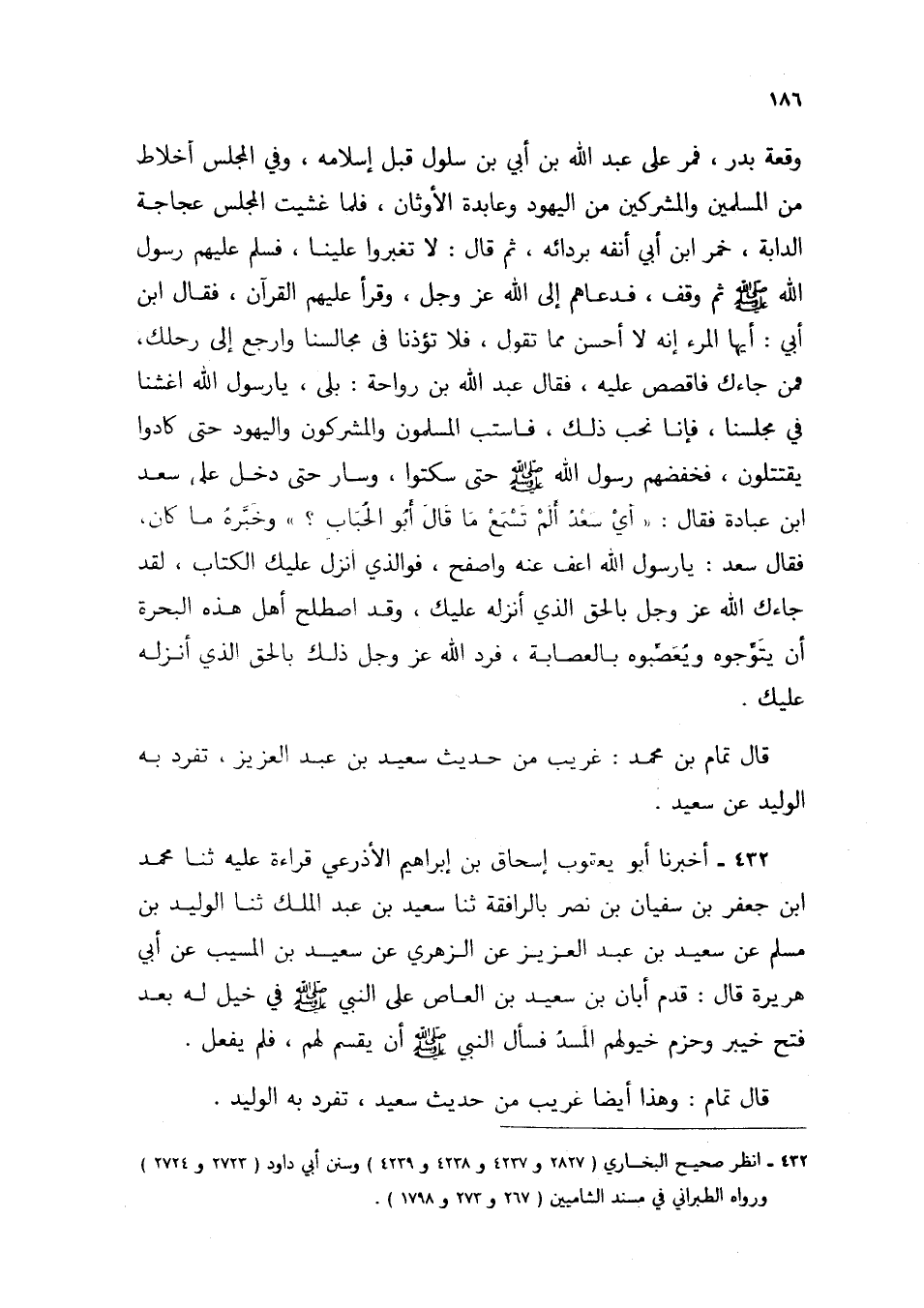 432 - أَخْبَرَنَا أَبُو يَعْقُوبَ إِسْحَاقُ بْنُ إِبْرَاهِيمَ الْأَذْرَعِيُّ قِرَاءَةً عَلَيْهِ، ثنا مُحَمَّدُ بْنُ جَعْفَرِ بْنِ سُفْيَانَ بْنِ نَصْرٍ، بِالرَّافِقَةِ، ثنا سَعِيدُ بْنُ عَبْدِ الْمَلِكِ، ثنا الْوَلِيدُ بْنُ مُسْلِمٍ، عَنْ سَعِيدِ بْنِ عَبْدِ الْعَزِيزِ، عَنِ الزُّهْرِيِّ، عَنْ سَعِيدِ بْنِ الْمُسَيِّبِ، عَنْ أَبِي هُرَيْرَةَ، قَالَ: «قَدِمَ أَبَانُ بْنُ سَعِيدِ بْنِ الْعَاصِ عَلَى النَّبِيِّ صَلَّى اللهُ عَلَيْهِ وَسَلَّمَ فِي خَيْلٍ لَهُ بَعْدَ فَتْحِ خَيْبَرَ وَحُزُمُ خُيُولِهِمُ الْمَسَدُّ، §فَسَأَلَ النَّبِيَّ صَلَّى اللهُ عَلَيْهِ وَسَلَّمَ أَنْ يَقْسِمَ لَهُمْ فَلَمْ يَفْعَلْ» قَالَ تَمَّامٌ: «وَهَذَا أَيْضًا غَرِيبٌ مِنْ حَدِيثِ سَعِيدٍ تَفَرَّدَ بِهِ الْوَلِيدُ»