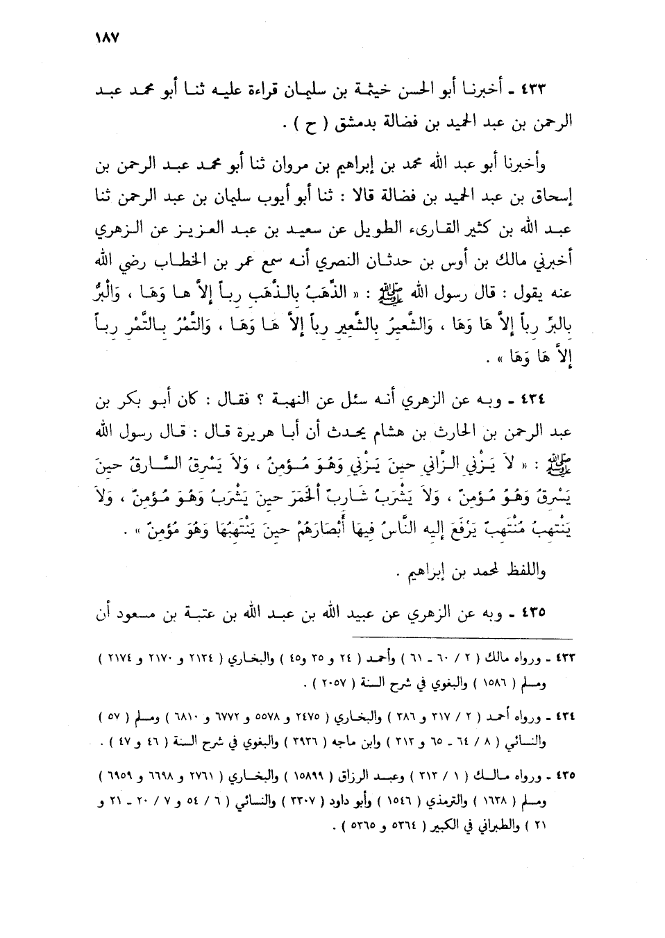 433 - أَخْبَرَنَا أَبُو الْحَسَنِ خَيْثَمَةُ بْنُ سُلَيْمَانَ قِرَاءَةً عَلَيْهِ، ثنا أَبُو مُحَمَّدٍ عَبْدُ الرَّحْمَنِ بْنُ عَبْدِ الْحَمِيدِ بْنِ فَضَالَةَ، بِدِمَشْقَ، ح وَأَخْبَرَنَا أَبُو عَبْدِ اللَّهِ مُحَمَّدُ بْنُ إِبْرَاهِيمَ بْنِ مَرْوَانَ، ثنا أَبُو مُحَمَّدٍ عَبْدُ الرَّحْمَنِ بْنُ إِسْحَاقَ بْنِ عَبْدِ الْحَمِيدِ بْنِ فَضَالَةَ، قَالَا: ثنا أَبُو أَيُّوبَ سُلَيْمَانُ بْنُ عَبْدِ الرَّحْمَنِ، ثنا عَبْدُ اللَّهِ بْنُ كَثِيرٍ الْقَارِئُ الطَّوِيلُ، عَنْ سَعِيدِ بْنِ عَبْدِ الْعَزِيزِ، عَنِ الزُّهْرِيِّ، أَخْبَرَنِي مَالِكُ بْنُ أَوْسِ بْنِ حَدَثَانَ النَّصْرِيُّ، أَنَّهُ سَمِعَ عُمَرَ بْنَ الْخَطَّابٍ رَضِيَ اللَّهُ عَنْهُ، يَقُولُ: قَالَ رَسُولُ اللَّهِ صَلَّى اللهُ عَلَيْهِ وَسَلَّمَ: «§الذَّهَبُ بِالذَّهَبِ رِبًا إِلَّا هَا وَهَا، وَالْبُرُّ بِالْبُرِّ رِبًا إِلَّا هَا وَهَا، وَالشَّعِيرُ بِالشَّعِيرِ رِبًا إِلَّا هَا وَهَا، وَالتَّمْرُ بِالتَّمْرِ رِبًا إِلَّا هَا وَهَا»