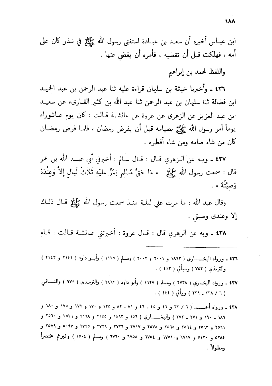 437 - وَبِهِ عَنِ الزُّهْرِيِّ، قَالَ: قَالَ سَالِمٌ: أَخْبَرَنِي أَبِي عَبْدُ اللَّهِ بْنُ عُمَرَ، قَالَ: سَمِعْتُ رَسُولَ اللَّهِ صَلَّى اللهُ عَلَيْهِ وَسَلَّمَ: §«مَا حَقُّ مُسْلِمٍ يَمُرُّ عَلَيْهِ ثَلَاثُ لَيَالٍ إِلَّا وَعِنْدَهُ وَصِيَّتُهُ» وَقَالَ عَبْدُ اللَّهِ: «مَا مَرَّتْ لَيْلَةٌ عَلَيَّ مُنْذُ سَمِعْتُ رَسُولَ اللَّهِ صَلَّى اللهُ عَلَيْهِ وَسَلَّمَ قَالَ ذَلِكَ إِلَّا وَعِنْدِي وَصِيَّتِي»