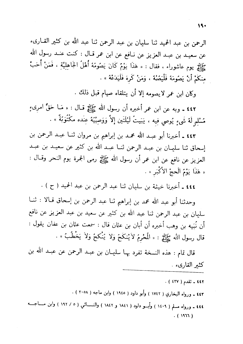 444 - أَخْبَرَنَا خَيْثَمَةُ بْنُ سُلَيْمَانَ، ثنا عَبْدُ الرَّحْمَنِ بْنُ عَبْدِ الْحَمِيدِ، ح وَحَدَّثَنَا أَبُو عَبْدِ اللَّهِ مُحَمَّدُ بْنُ إِبْرَاهِيمَ، ثنا عَبْدُ الرَّحْمَنِ بْنُ إِسْحَاقَ، قَالَا: ثنا سُلَيْمَانُ بْنُ عَبْدِ الرَّحْمَنِ، ثنا عَبْدُ اللَّهِ بْنُ كَثِيرٍ، عَنْ سَعِيدِ بْنِ عَبْدِ الْعَزِيزِ، عَنْ نَافِعٍ، أَنَّ نُبَيْهَ بْنَ وَهْبٍ، أَخْبَرَهُ، أَنَّ أَبَانَ بْنَ عُثْمَانَ، قَالَ: سَمِعْتُ عُثْمَانَ بْنَ عَفَّانَ، يَقُولُ: قَالَ رَسُولُ اللَّهِ صَلَّى اللهُ عَلَيْهِ وَسَلَّمَ: «§الْمُحْرِمُ لَا يَنْكِحُ، وَلَا يُنْكَحُ، وَلَا يَخْطُبُ» قَالَ تَمَّامٌ: «هَذِهِ النُّسْخَةُ تَفَرَّدَ بِهَا سُلَيْمَانُ بْنُ عَبْدِ الرَّحْمَنِ، عَنْ عَبْدِ اللَّهِ بْنِ كَثِيرٍ الْقَارِئِ -[191]-، وَقَرَأْتُهَا أَنَا عَلَى تَمَّامٍ كُلَّ حَدِيثٍ بِإِسْنَادِهِ قَرَأْتُهُ عَلَيْهِ، وَكَذَا كَانَ فِي كِتَابِهِ وَإِنَّمَا أَنَا أَدْرَجْتُهَا»