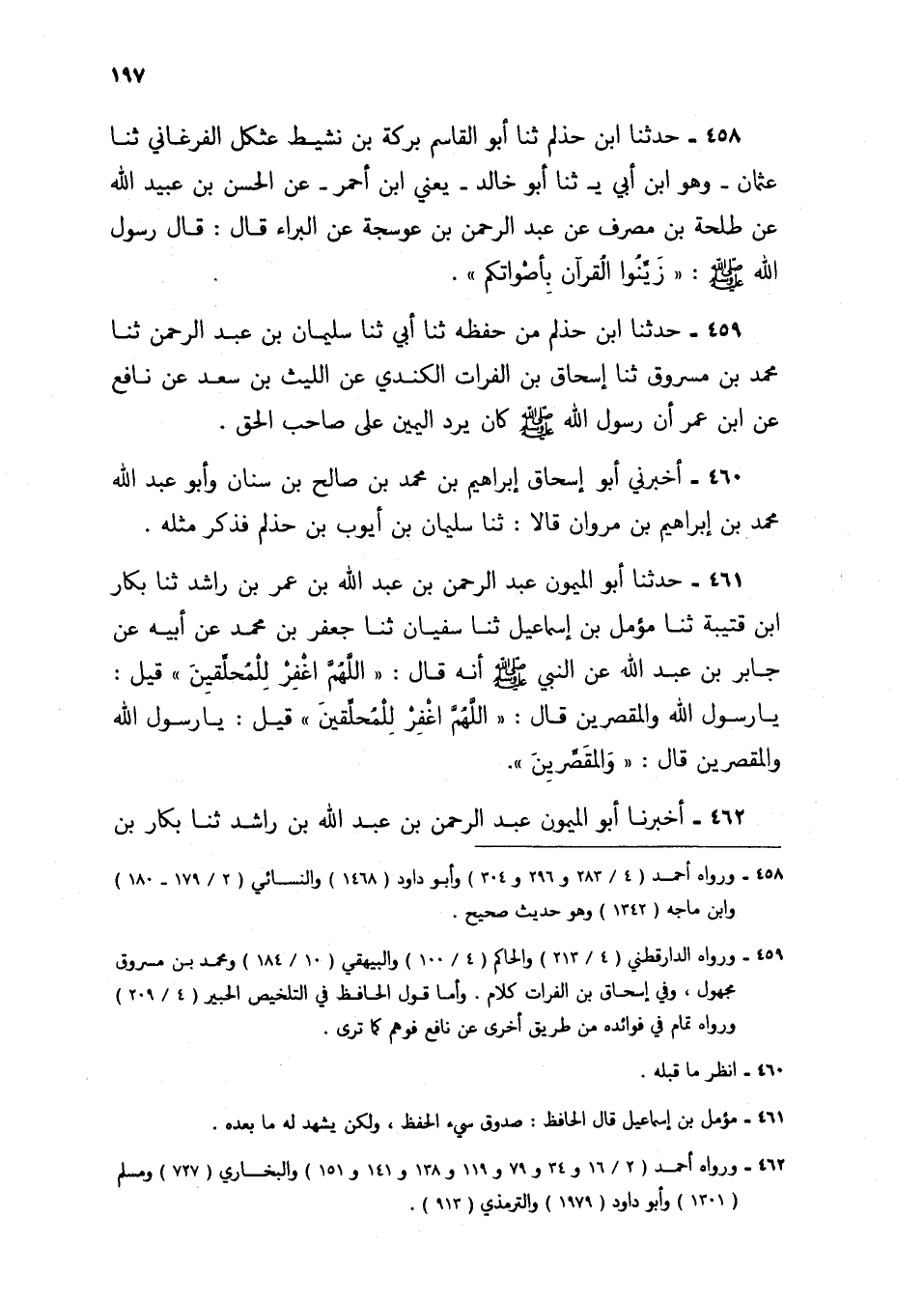 458 - حَدَّثَنَا ابْنُ حَذْلَمٍ، ثنا أَبُو الْقَاسِمِ بَرَكَةُ بْنُ نَشِيطٍ عَثْكَلُ الْفَرْغَانِيُّ، ثنا عُثْمَانُ وَهُوَ ابْنُ أَبِي، ثنا أَبُو خَالِدٍ يَعْنِي ابْنَ أَحْمَرَ، عَنِ الْحَسَنِ بْنِ عُبَيْدِ اللَّهِ، عَنْ طَلْحَةَ بْنِ مُصَرِّفٍ، عَنْ عَبْدِ الرَّحْمَنِ بْنِ عَوْسَجَةَ، عَنِ الْبَرَاءِ، قَالَ: قَالَ رَسُولُ اللَّهِ صَلَّى اللهُ عَلَيْهِ وَسَلَّمَ: §«زَيِّنُوا الْقُرْآنَ بِأَصْوَاتِكُمْ»