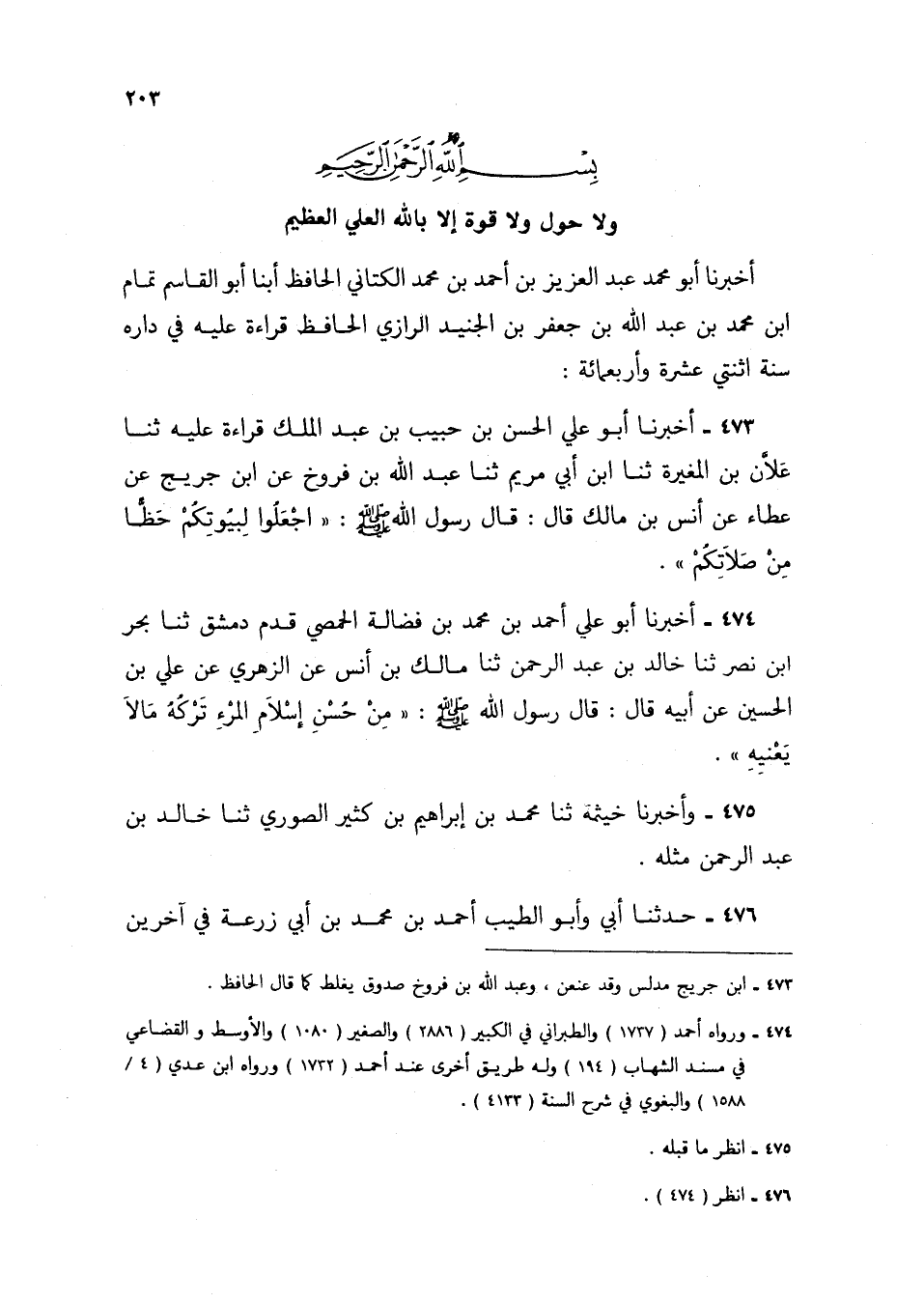 474 - أَخْبَرَنَا أَبُو عَلِيٍّ أَحْمَدُ بْنُ مُحَمَّدِ بْنِ فَضَالَةَ الْحِمْصِيُّ قَدِمَ دِمَشْقَ، ثنا بَحْرُ بْنُ نَصْرٍ، ثنا خَالِدُ بْنُ عَبْدِ الرَّحْمَنِ، ثنا مَالِكُ بْنُ أَنَسٍ، عَنِ الزُّهْرِيِّ، عَنْ عَلِيِّ بْنِ الْحُسَيْنِ، عَنْ أَبِيهِ، قَالَ: قَالَ رَسُولُ اللَّهِ صَلَّى اللهُ عَلَيْهِ وَسَلَّمَ: §«مِنْ حُسْنِ إِسْلَامِ الْمَرْءِ تَرْكُهُ مَا لَا يَعْنِيهِ»
