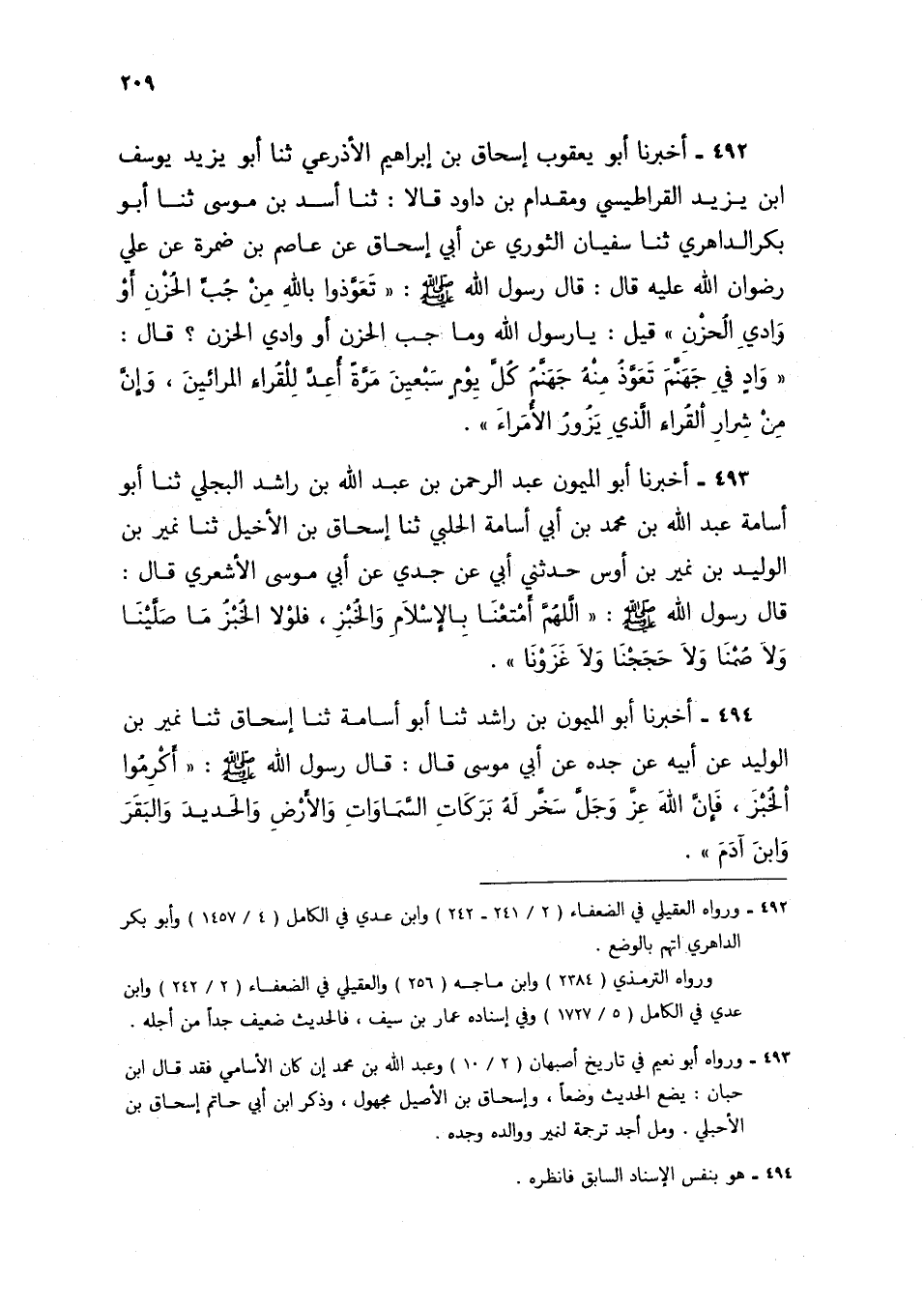 492 - أَخْبَرَنَا أَبُو يَعْقُوبَ إِسْحَاقُ بْنُ إِبْرَاهِيمَ الْأَذْرَعِيُّ، ثنا أَبُو يَزِيدَ يُوسُفُ بْنُ يَزِيدَ الْقَرَاطِيسِيُّ، وَمِقْدَامُ بْنُ دَاوُدَ، قَالَا: ثنا أَسَدُ بْنُ مُوسَى، ثنا أَبُو بَكْرٍ الدَّاهِرِيُّ، ثنا سُفْيَانُ الثَّوْرِيُّ، عَنْ أَبِي إِسْحَاقَ، عَنْ عَاصِمِ بْنِ ضَمْرَةَ، عَنْ عَلِيٍّ رِضْوَانُ اللَّهِ عَلَيْهِ، قَالَ: قَالَ رَسُولُ اللَّهِ صَلَّى اللهُ عَلَيْهِ وَسَلَّمَ: §«تَعَوَّذُوا بِاللَّهِ مِنْ جُبِّ الْحُزْنِ أَوْ وَادِي الْحُزْنِ» قِيلَ: يَا رَسُولَ اللَّهِ وَمَا جُبُّ الْحُزْنِ أَوْ وَادِي الْحُزْنِ؟ قَالَ: «وَادٍ فِي جَهَنَّمَ تَعَوَّذُ مِنْهُ جَهَنَّمُ كُلَّ يَوْمٍ سَبْعِينَ مَرَّةً أُعِدَّ لِلْقُرَّاءِ الْمُرَائِينَ، وَإِنَّ مِنْ شِرَارِ الْقُرَّاءِ الَّذِي يَزُورُ الْأُمَرَاءَ»