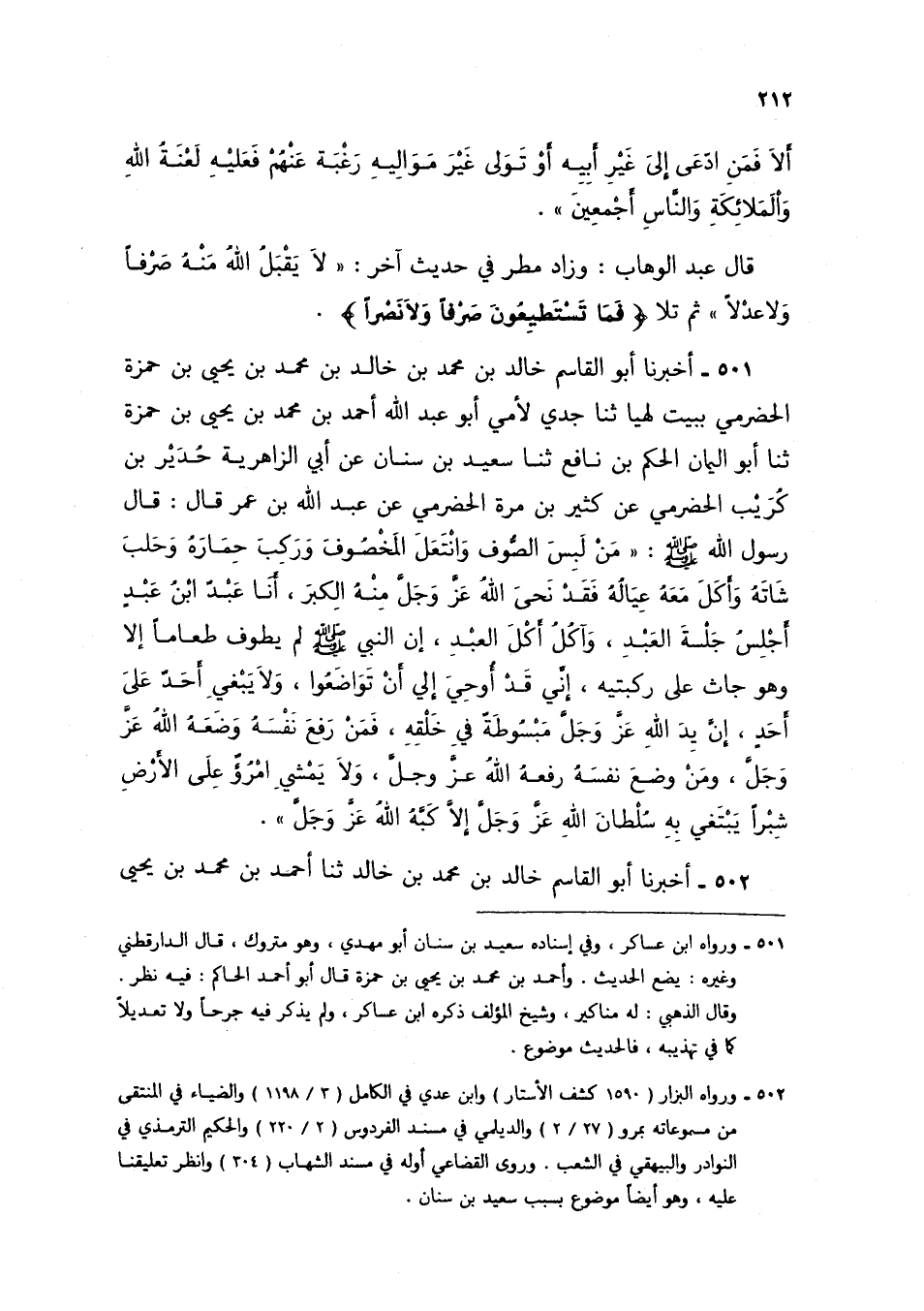 501 - أَخْبَرَنَا أَبُو الْقَاسِمِ خَالِدُ بْنُ مُحَمَّدِ بْنِ خَالِدِ بْنِ مُحَمَّدِ بْنِ يَحْيَى بْنِ حَمْزَةَ الْحَضْرَمِيُّ بِبَيْتِ لَهْيَا، ثنا جَدِّي لِأُمِّي أَبُو عَبْدِ اللَّهِ أَحْمَدُ بْنُ مُحَمَّدِ بْنِ يَحْيَى بْنِ حَمْزَةَ، ثنا أَبُو الْيَمَانِ الْحَكَمُ بْنُ نَافِعٍ، ثنا سَعِيدُ بْنُ سِنَانٍ، عَنْ أَبِي الزَّاهِرِيَّةِ حُدَيْرِ بْنِ كُرَيْبٍ الْحَضْرَمِيِّ، عَنْ كَثِيرِ بْنِ مُرَّةَ الْحَضْرَمِيِّ، عَنْ عَبْدِ اللَّهِ بْنِ عُمَرَ، قَالَ: قَالَ رَسُولُ اللَّهِ صَلَّى اللهُ عَلَيْهِ وَسَلَّمَ: «§مَنْ لَبِسَ الصُّوفَ وَانْتَعَلَ الْمَخْصُوفَ وَرَكِبَ حِمَارَهُ، وَحَلَبَ شَاتَهُ وَأَكَلَ مَعَهُ عِيَالُهُ فَقَدْ نَحَّى اللَّهُ عَزَّ وَجَلَّ مِنْهُ الْكِبْرَ، أَنَا عَبْدٌ ابْنُ عَبْدٍ أَجْلِسُ جِلْسَةَ الْعَبْدِ، وَآكُلُ أَكْلَ الْعَبْدِ، إِنَّ النَّبِيَّ صَلَّى اللهُ عَلَيْهِ وَسَلَّمَ لَمْ يَطُوفَ طَعَامًا إِلَّا، وَهُوَ جَاثٍ عَلَى رُكْبَتَيْهِ، إِنِّي قَدْ أُوحِيَ إِلَيَّ أَنْ تَوَاضَعُوا، وَلَا يَبْغِي أَحَدٌ عَلَى أَحَدٍ، إِنَّ يَدَ اللَّهِ عَزَّ وَجَلَّ مَبْسُوطَةٌ فِي خَلْقِهِ، فَمَنْ رَفَعَ نَفْسَهُ وَضَعَهُ اللَّهُ عَزَّ وَجَلَّ، وَمَنْ وَضَعَ نَفْسَهُ رَفَعَهُ اللَّهُ عَزَّ وَجَلَّ، وَلَا يَمْشِي امْرُؤٌ عَلَى الْأَرْضِ شِبْرًا يَبْتَغِي بِهِ سُلْطَانَ اللَّهِ عَزَّ وَجَلَّ إِلَّا كَبَّهُ اللَّهُ عَزَّ وَجَلَّ»