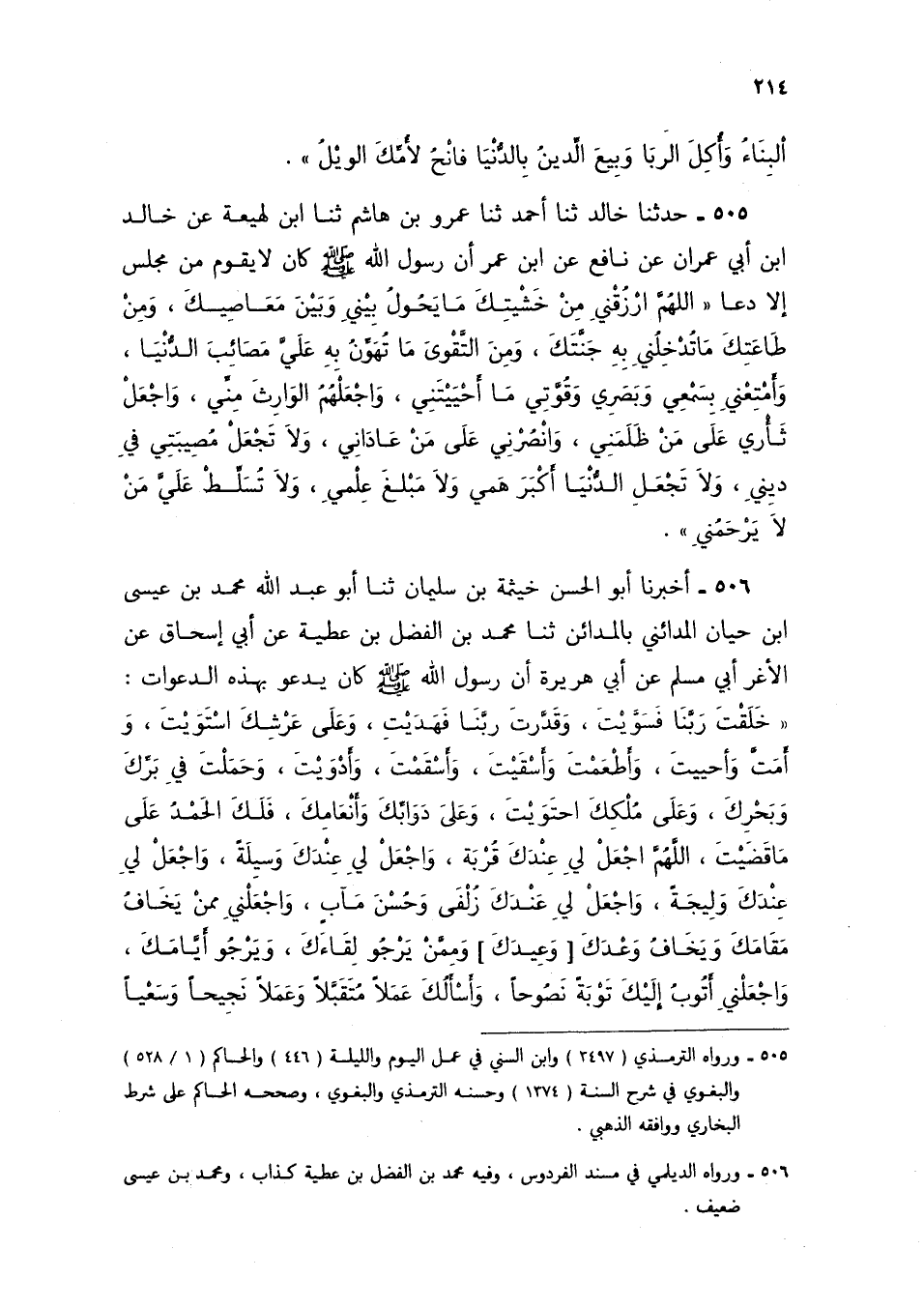 505 - حَدَّثَنَا خَالِدٌ، ثنا أَحْمَدُ، ثنا عَمْرُو بْنُ هَاشِمٍ، ثنا ابْنُ لَهِيعَةَ، عَنْ خَالِدِ بْنِ أَبِي عِمْرَانَ، عَنْ نَافِعٍ، عَنِ ابْنِ عُمَرَ، أَنَّ رَسُولَ اللَّهِ صَلَّى اللهُ عَلَيْهِ وَسَلَّمَ كَانَ لَا يَقُومُ مِنْ مَجْلِسٍ إِلَّا دَعَا: «§اللَّهُمَّ ارْزُقْنِي مِنْ خَشْيَتِكَ مَا يَحُولُ بَيْنِي وَبَيْنَ مَعَاصِيكَ، وَمِنْ طَاعَتِكَ مَا تُدْخِلُنِي بِهِ جَنَّتَكَ، وَمِنَ التَّقْوَى مَا تُهَوِّنُ بِهِ عَلَيَّ مَصَائِبَ الدُّنْيَا، وَأَمْتِعْنِي بِسَمْعِي وَبَصَرِي وَقُوَّتِي مَا أَحْيَيْتَنِي، وَاجْعَلْهُمُ الْوَارِثَ مِنِّي، وَاجْعَلْ ثَأْرِي عَلَى مَنْ ظَلَمَنِي، وَانْصُرْنِي عَلَى مَنْ عَادَانِي، وَلَا تَجْعَلْ مُصِيبَتِي فِي دِينِي، وَلَا تَجْعَلِ الدُّنْيَا أَكْبَرَ هَمِّي، وَلَا مَبْلَغَ عِلْمِي، وَلَا تُسَلِّطْ عَلَيَّ مَنْ لَا يَرْحَمُنِي»