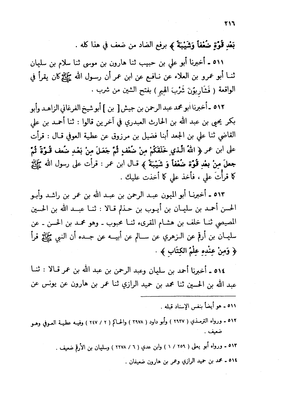512 - أَخْبَرَنَا أَبُو مُحَمَّدٍ عَبْدُ الرَّحْمَنِ بْنُ جَيْشِ بْنِ أَبِي شَيْخٍ الْفَرْغَانِيُّ الزَّاهِدُ، وَأَبُو بَكْرٍ يَحْيَى بْنُ عَبْدِ اللَّهِ بْنِ الْحَارِثِ الْعَبْدَرِيُّ فِي آخَرِينَ قَالُوا: ثنا أَحْمَدُ بْنُ عَلِيٍّ الْقَاضِي، ثنا عَلِيُّ بْنُ الْجَعْدِ، أبنا فُضَيْلُ بْنُ مَرْزُوقٍ، عَنْ عَطِيَّةَ الْعَوْفِيِّ، قَالَ: قَرَأْتُ عَلَى ابْنِ عُمَرَ {اللَّهُ الَّذِي خَلَقَكُمْ مِنْ ضَعْفٍ ثُمَّ جَعَلَ مِنْ بَعْدِ ضَعْفٍ قُوَّةً، ثُمَّ جَعَلَ مِنْ بَعْدِ قُوَّةٍ ضَعْفًا وَشَيْبَةً} [الروم: 54] قَالَ ابْنُ عُمَرَ: §«قَرَأْتُ عَلَى رَسُولِ اللَّهِ صَلَّى اللهُ عَلَيْهِ وَسَلَّمَ كَمَا قَرَأْتَ عَلَيَّ فَأَخَذَ عَلَيَّ كَمَا أَخَذْتُ عَلَيْكَ»