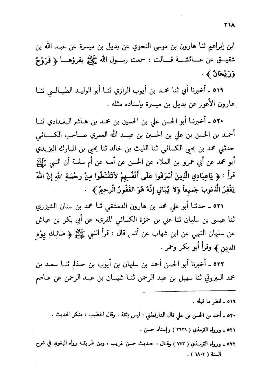 520 - أَخْبَرَنَا أَبُو الْحَسَنِ عَلِيُّ بْنُ الْحُسَيْنِ بْنِ مُحَمَّدِ بْنِ هَاشِمٍ الْبَغْدَادِيُّ، ثنا أَحْمَدُ بْنُ الْحَسَنِ بْنِ عَلِيِّ بْنِ الْحُسَيْنِ بْنِ عَبْدِ اللَّهِ الْعُمَرِيُّ، صَاحِبُ الْكِسَائِيِّ، حَدَّثَنِي مُحَمَّدُ بْنُ يَحْيَى الْكِسَائِيُّ، ثنا اللَّيْثُ بْنُ خَالِدٍ، ثنا يَحْيَى بْنُ الْمُبَارَكِ الْيَزِيدِيُّ أَبُو مُحَمَّدٍ، عَنْ أَبِي عَمْرِو بْنِ الْعَلَاءِ، عَنِ الْحَسَنِ، عَنْ أُمِّهِ، عَنْ أُمِّ سَلَمَةَ، أَنَّ النَّبِيَّ صَلَّى اللهُ عَلَيْهِ وَسَلَّمَ: §«قَرَأَ (يَا عِبَادِيَ الَّذِينَ أَسْرَفُوا عَلَى أَنْفُسِهِمْ لَا تَقْنَطُوا مِنْ رَحْمَةِ اللَّهِ إِنَّ اللَّهَ يَغْفِرُ الذُّنُوبَ جَمِيعًا، وَلَا يُبَالِي إِنَّهُ هُوَ الْغَفُورُ الرَّحِيمُ) »