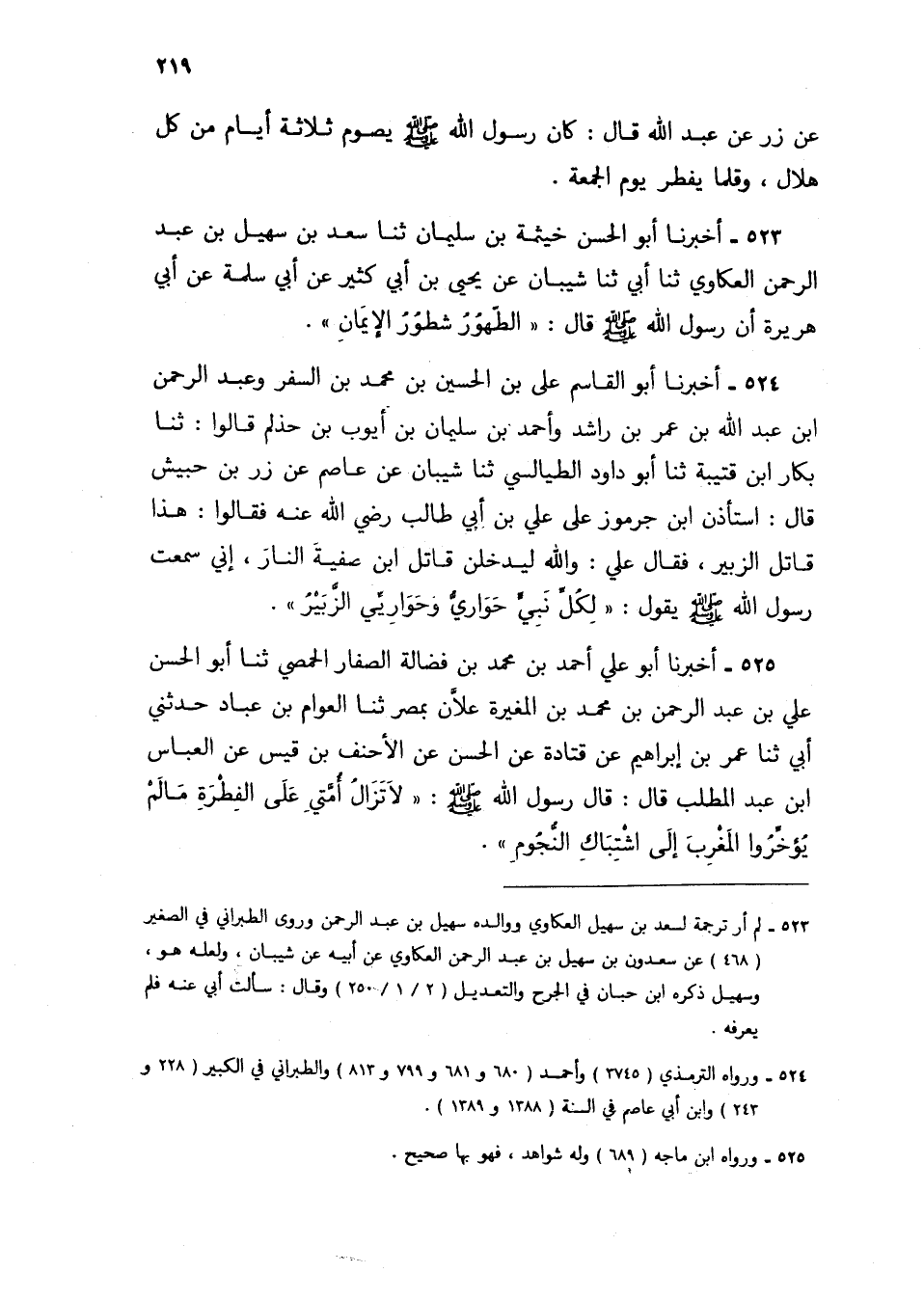 525 - أَخْبَرَنَا أَبُو عَلِيٍّ أَحْمَدُ بْنُ مُحَمَّدِ بْنِ فَضَالَةَ الصَّفَّارُ الْحِمْصِيُّ، ثنا أَبُو الْحَسَنِ عَلِيُّ بْنُ عَبْدِ الرَّحْمَنِ بْنِ مُحَمَّدِ بْنِ الْمُغِيرَةِ عَلَّانُ بِمِصْرَ، ثنا الْعَوَّامُ بْنُ عَبَّادٍ، حَدَّثَنِي أَبِي، ثنا عُمَرُ بْنُ إِبْرَاهِيمَ، عَنْ قَتَادَةَ، عَنِ الْحَسَنِ، عَنِ الْأَحْنَفِ بْنِ قَيْسٍ، عَنِ الْعَبَّاسِ بْنِ عَبْدِ الْمُطَّلِبِ، قَالَ: قَالَ رَسُولُ اللَّهِ صَلَّى اللهُ عَلَيْهِ وَسَلَّمَ: §«لَا تَزَالُ أُمَّتِي عَلَى الْفِطْرَةِ، مَا لَمْ يُؤَخِّرُوا الْمَغْرِبَ إِلَى اشْتِبَاكِ النُّجُومِ»