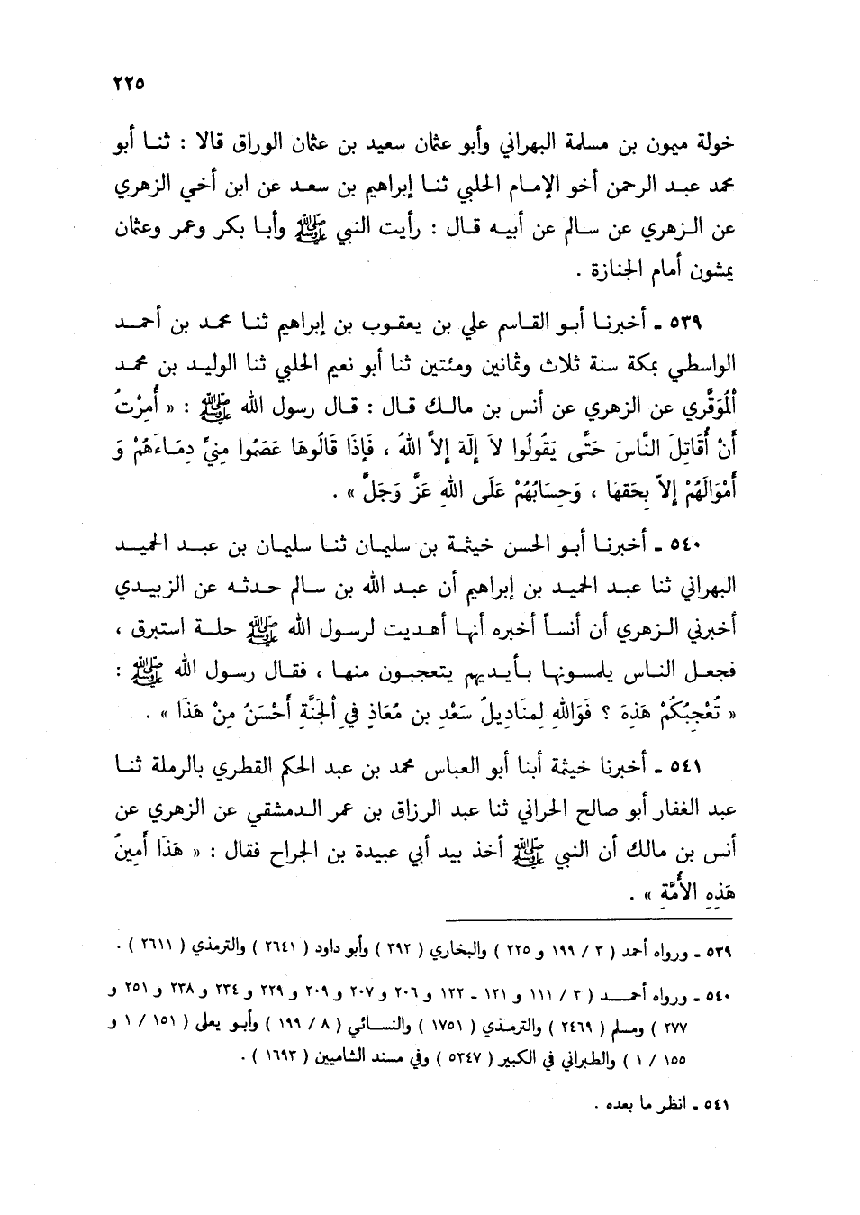 539 - أَخْبَرَنَا أَبُو الْقَاسِمِ عَلِيُّ بْنُ يَعْقُوبَ بْنِ إِبْرَاهِيمَ، ثنا مُحَمَّدُ بْنُ أَحْمَدَ الْوَاسِطِيُّ، بِمَكَّةَ سَنَةَ ثَلَاثٍ وَثَمَانِينَ وَمِائَتَيْنِ، ثنا أَبُو نُعَيْمٍ الْحَلَبِيُّ، ثنا الْوَلِيدُ بْنُ مُحَمَّدٍ الْمُوَقَّرِيُّ، عَنِ الزُّهْرِيِّ، عَنْ أَنَسِ بْنِ مَالِكٍ، قَالَ: قَالَ رَسُولُ اللَّهِ صَلَّى اللهُ عَلَيْهِ وَسَلَّمَ: §«أُمِرْتُ أَنْ أُقَاتِلَ النَّاسَ حَتَّى يَقُولُوا لَا إِلَهَ إِلَّا اللَّهُ، فَإِذَا قَالُوهَا عَصَمُوا مِنِّي دِمَاءَهُمْ وَأَمْوَالَهُمْ إِلَّا بِحَقِّهَا، وَحِسَابُهُمْ عَلَى اللَّهِ عَزَّ وَجَلَّ»