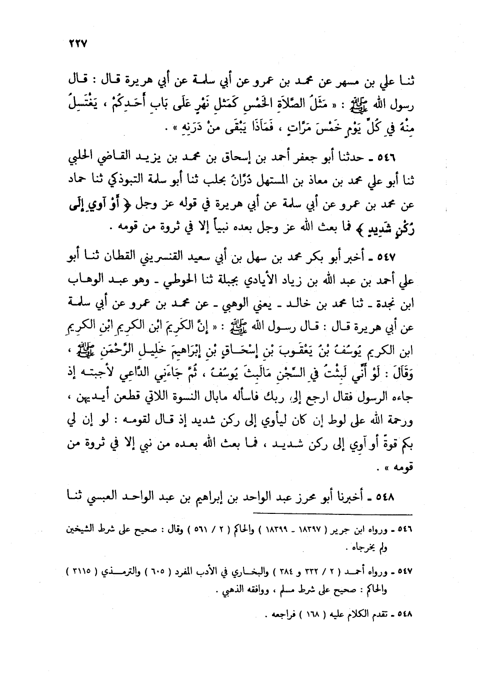 547 - أَخْبَرَ أَبُو بَكْرٍ مُحَمَّدُ بْنُ سَهْلِ بْنِ أَبِي سَعِيدٍ الْقِنَّسْرِينِيُّ الْقَطَّانُ، ثنا أَبُو عَلِيٍّ أَحْمَدُ بْنُ عَبْدِ اللَّهِ بْنِ زِيَادٍ الْإِيَادِيُّ بِجِبَلَةَ، ثنا الْحَوْطِيُّ وَهُوَ عَبْدُ الْوَهَّابِ بْنُ نَجْدَةَ، ثنا مُحَمَّدُ بْنُ خَالِدٍ يَعْنِي الْوَهْبِيَّ، عَنْ مُحَمَّدِ بْنِ عَمْرٍو، عَنْ أَبِي سَلَمَةَ، عَنْ أَبِي هُرَيْرَةَ، قَالَ: قَالَ رَسُولُ اللَّهِ صَلَّى اللهُ عَلَيْهِ وَسَلَّمَ: " إِنَّ §الْكَرِيمَ ابْنَ الْكَرِيمِ ابْنِ الْكَرِيمِ ابْنِ الْكَرِيمِ يُوسُفُ بْنُ يَعْقُوبَ بْنِ إِسْحَاقَ بْنِ إِبْرَاهِيمَ خَلِيلِ الرَّحْمَنِ صَلَّى اللهُ عَلَيْهِ وَسَلَّمَ، وَقَالَ: لَوْ أَنِّي لَبِثْتُ فِي السِّجْنِ مَا لَبِثَ يُوسُفُ، ثُمَّ جَاءَنِي الدَّاعِي لَأَجَبْتُهُ إِذْ جَاءَهُ الرَّسُولُ، فَقَالَ: ارْجِعْ إِلَى رَبِّكَ فَاسْأَلْهُ مَا بَالُ النِّسْوَةِ اللَّاتِي قَطَّعْنَ أَيْدِيَهُنَّ، وَرَحْمَةُ اللَّهِ عَلَى لُوطٍ إِنْ كَانَ لَيَأْوِي إِلَى رُكْنٍ شَدِيدٍ إِذْ قَالَ لِقَوْمِهِ: لَوْ أَنَّ لِي بِكُمْ قُوَّةً أَوْ آوِي إِلَى رُكْنٍ شَدِيدٍ، فَمَا بَعَثَ اللَّهُ بَعْدَهُ مِنْ نَبِيٍّ إِلَّا فِي ثَرْوَةٍ مِنْ قَوْمِهِ "