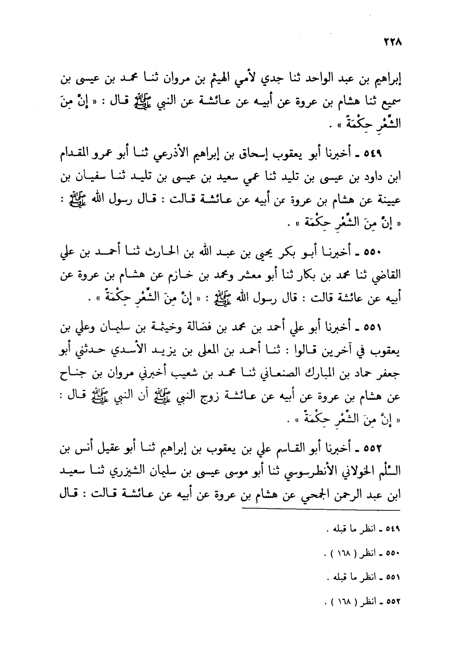 551 - أَخْبَرَنَا أَبُو عَلِيٍّ أَحْمَدُ بْنُ مُحَمَّدِ بْنِ فَضَالَةَ، وَخَيْثَمَةُ بْنُ سُلَيْمَانَ، وَعَلِيُّ بْنُ يَعْقُوبَ فِي آخَرِينَ قَالُوا: ثنا أَحْمَدُ بْنُ الْمُعَلَّى بْنِ يَزِيدَ الْأَسَدِيُّ، حَدَّثَنِي أَبُو جَعْفَرٍ حَمَّادُ بْنُ الْمُبَارَكِ الصَّنْعَانِيُّ، ثنا مُحَمَّدُ بْنُ شُعَيْبٍ، أَخْبَرَنِي مَرْوَانُ بْنُ جَنَاحٍ، عَنْ هِشَامِ بْنِ عُرْوَةَ، عَنْ أَبِيهِ، عَنْ عَائِشَةَ، زَوْجِ النَّبِيِّ صَلَّى اللهُ عَلَيْهِ وَسَلَّمَ، أَنَّ النَّبِيَّ صَلَّى اللهُ عَلَيْهِ وَسَلَّمَ قَالَ: «إِنَّ §مِنَ الشِّعْرِ حِكْمَةً»
