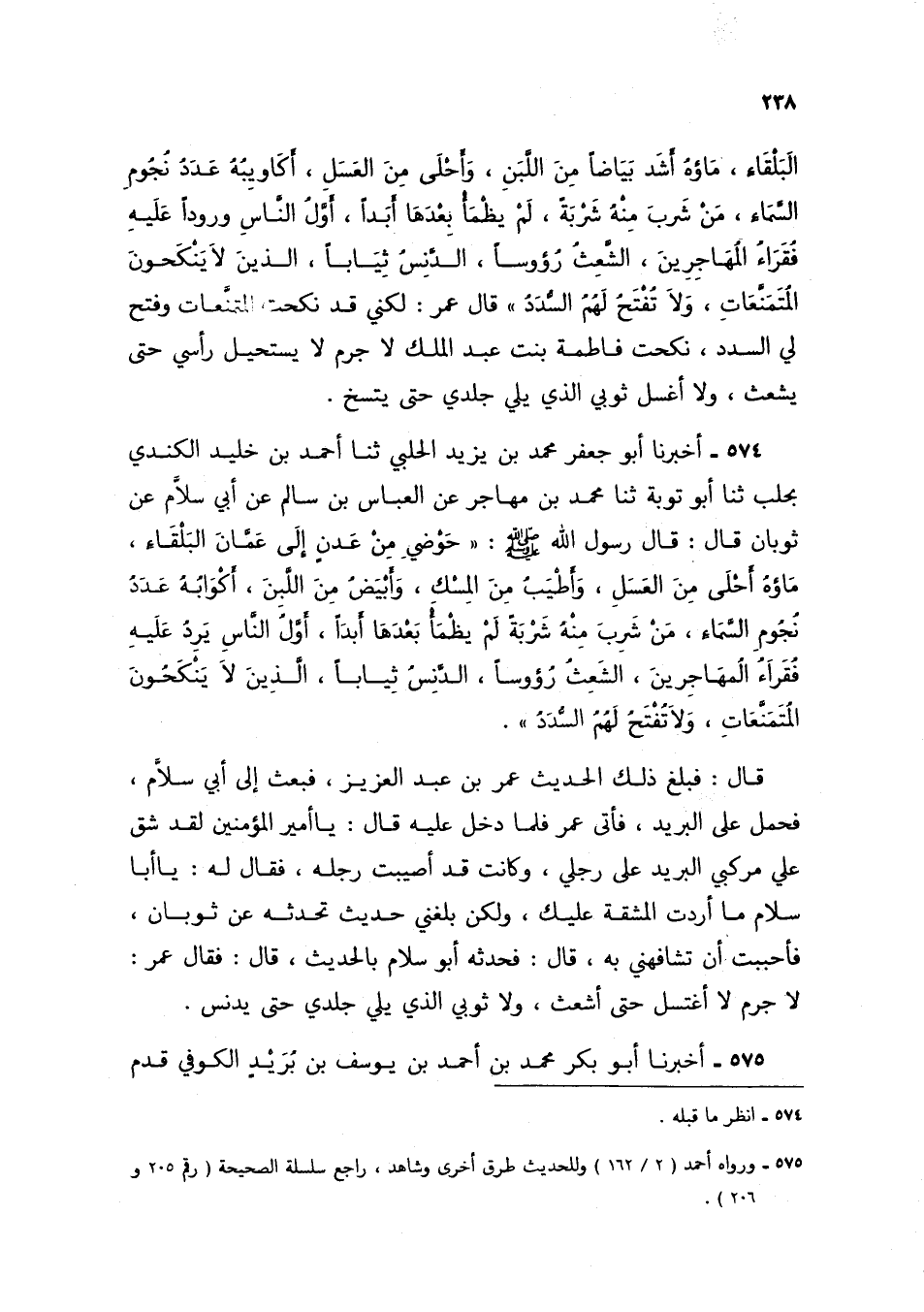574 - أَخْبَرَنَا أَبُو جَعْفَرٍ مُحَمَّدُ بْنُ يَزِيدَ الْحَلَبِيُّ، ثنا أَحْمَدُ بْنُ خُلَيْدٍ الْكِنْدِيُّ، بِحَلَبَ، ثنا أَبُو تَوْبَةَ، ثنا مُحَمَّدُ بْنُ مُهَاجِرٍ، عَنِ الْعَبَّاسِ بْنِ سَالِمٍ، عَنْ أَبِي سَلَّامٍ، عَنْ ثَوْبَانَ، قَالَ: قَالَ رَسُولُ اللَّهِ صَلَّى اللهُ عَلَيْهِ وَسَلَّمَ: «§حَوْضِي مِنْ عَدَنَ إِلَى عَمَّانَ الْبَلْقَاءِ، مَاؤُهُ أَحْلَى مِنَ الْعَسَلِ وَأَطْيَبُ مِنَ الْمِسْكِ وَأَبْيَضُ مِنَ اللَّبَنِ، أَكْوَابُهُ عَدَدُ نُجُومِ السَّمَاءِ، مَنْ شَرِبَ مِنْهُ شَرْبَةً لَمْ يَظْمَأْ بَعْدَهَا أَبَدًا، أَوَّلُ النَّاسِ يَرِدُ عَلَيْهِ فُقَرَاءُ الْمُهَاجِرِينَ الشُّعْثُ رُءُوسًا الدُّنْسُ ثِيَابًا، الَّذِينَ لَا يَنْكِحُونَ الْمُتَمَنِّعَاتِ وَلَا تُفْتَحُ لَهُمُ السُّدَدُ» قَالَ: فَبَلَغَ ذَلِكَ الْحَدِيثُ عُمَرَ بْنَ عَبْدِ الْعَزِيزِ فَبَعَثَ إِلَى أَبِي سَلَّامٍ فَحُمِلَ عَلَى الْبَرِيدِ فَأَتَى عُمَرَ، فَلَمَّا دَخَلَ عَلَيْهِ قَالَ: يَا أَمِيرَ الْمُؤْمِنِينَ لَقَدْ شَقَّ عَلَيَّ مَرْكَبِي الْبَرِيدَ عَلَى رِجْلَيَّ، وَكَانَتْ قَدْ أُصِيبَتْ رِجْلُهُ، فَقَالَ لَهُ: «يَا أَبَا سَلَّامٍ مَا أَرَدْتُ الْمَشَقَّةَ عَلَيْكَ وَلَكِنْ بَلَغَنِي حَدِيثٌ تُحَدِّثُهُ عَنْ ثَوْبَانَ فَأَحْبَبْتُ أَنْ تُشَافِهَنِي بِهِ» قَالَ: فَحَدَّثَهُ أَبُو سَلَّامٍ بِالْحَدِيثِ قَالَ: فَقَالَ عُمَرُ: «لَا جَرَمَ لَا أَغْتَسِلُ حَتَّى أَشْعَثَ، وَلَا ثَوْبِي الَّذِي يَلِي جِلْدِي حَتَّى يُدَنَّسُ»