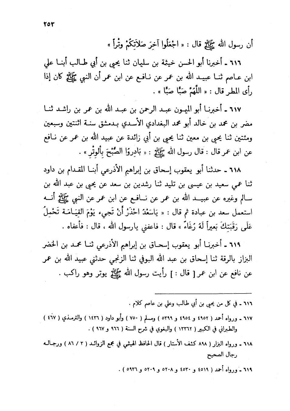 619 - أَخْبَرَنَا أَبُو يَعْقُوبَ إِسْحَاقُ بْنُ إِبْرَاهِيمَ الْأَذْرَعِيُّ، ثنا مُحَمَّدُ بْنُ الْخَضِرِ الْبَزَّازُ، بِالرَّقَّةِ، ثنا إِسْحَاقُ بْنُ عَبْدِ اللَّهِ الْبُوفِيُّ، ثنا الزَّنْجِيُّ، حَدَّثَنِي عُبَيْدُ اللَّهِ بْنُ عُمَرَ، عَنْ نَافِعٍ، عَنِ ابْنِ عُمَرَ، قَالَ: «رَأَيْتُ رَسُولَ اللَّهِ صَلَّى اللهُ عَلَيْهِ وَسَلَّمَ §يُوتِرُ وَهُوَ رَاكِبٌ»